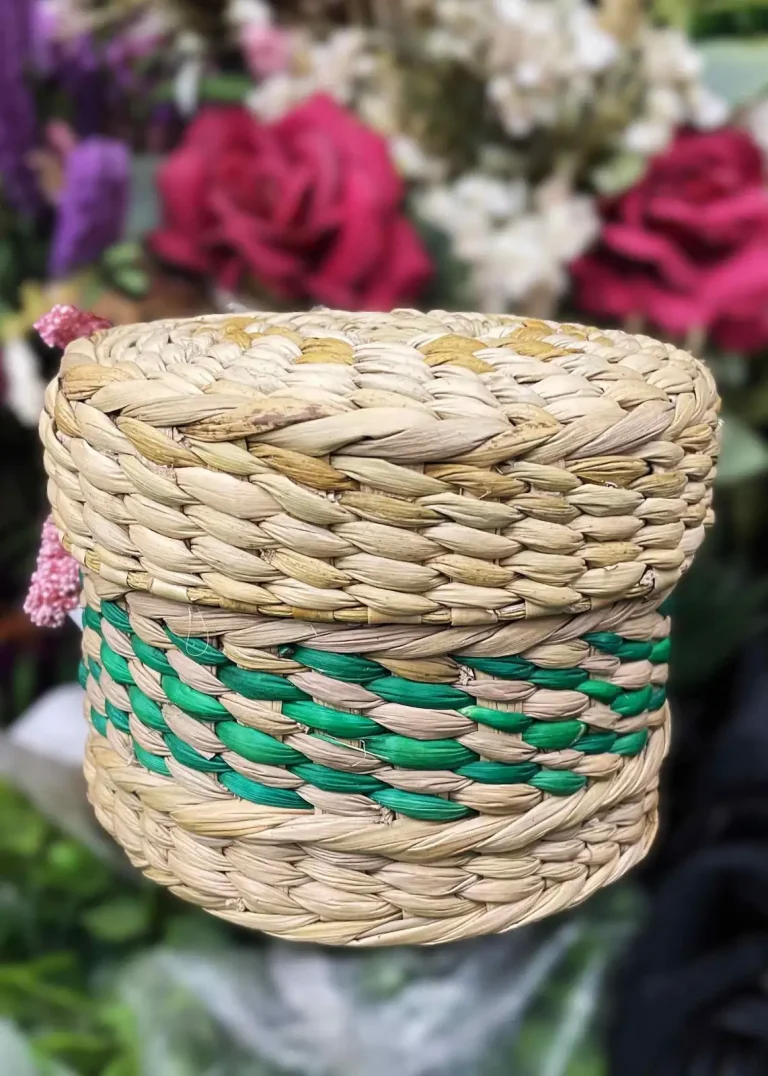 Handwoven Cane Basket with Green Accents