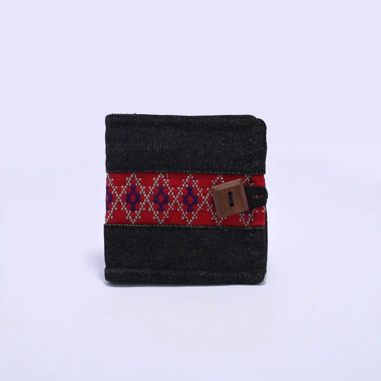 Zopar Handmade Black Denim Wallet with Traditional Red Woven Band & Wooden Square Button Closure
