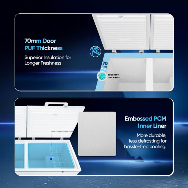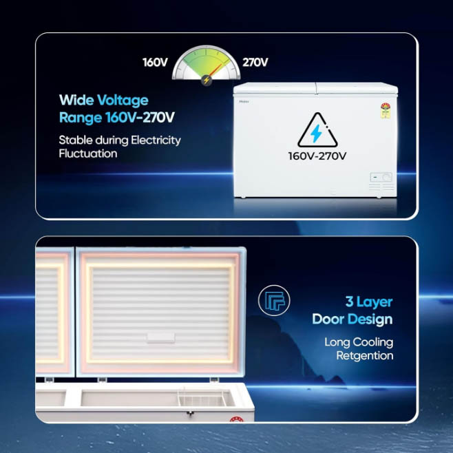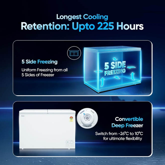 - Upto 225 hours of cooling retention – Lasting upto 9 days in case of power failure, thefreezer holds optimal temperature so your food stays safe and fresh for a long period