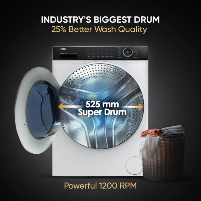 Industry-first extra-large 525mm super drum provides extra space and extra care to the garments, enhancing washing quality and efficiency