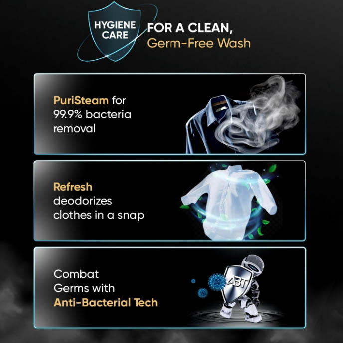 Anti-bacterial technology driven gasket and detergent drawer provides hygienically clean and safe wash by eliminating 99.8% of allergen microbes.