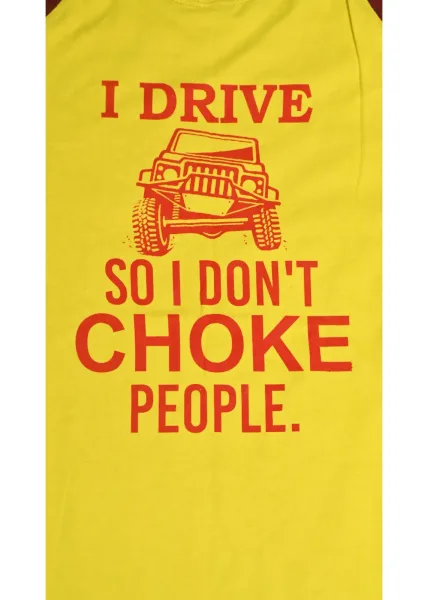 - This humorous t-shirt is perfect for anyone who loves to drive! It features a bright yellow base color with a bold graphic that says “I DRIVE SO I DON’T CHOKE PEOPLE” in a red font. The graphic also includes a cartoon-style car. The sleeves are a mix of green and red, adding a playful touch.