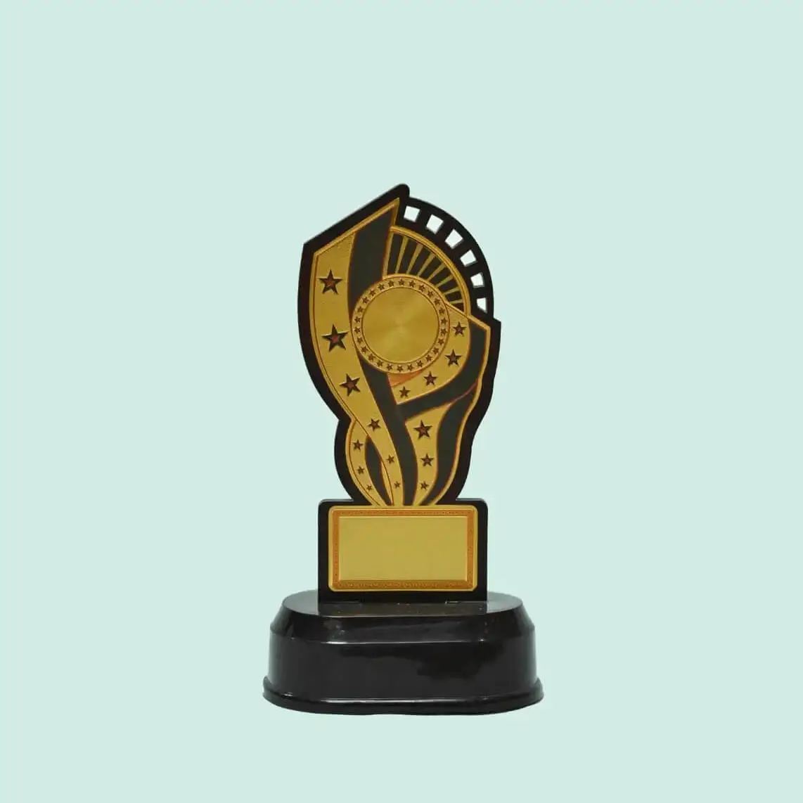 This award is designed to recognize and reward achievement in various fields. The black base provides a sleek and modern look, while the gold-plated center allows for personalization with engraving. The unique shape adds a touch of creativity and makes it a visually appealing award. It’s suitable for award ceremonies and competitions where recognizing excellence is important.