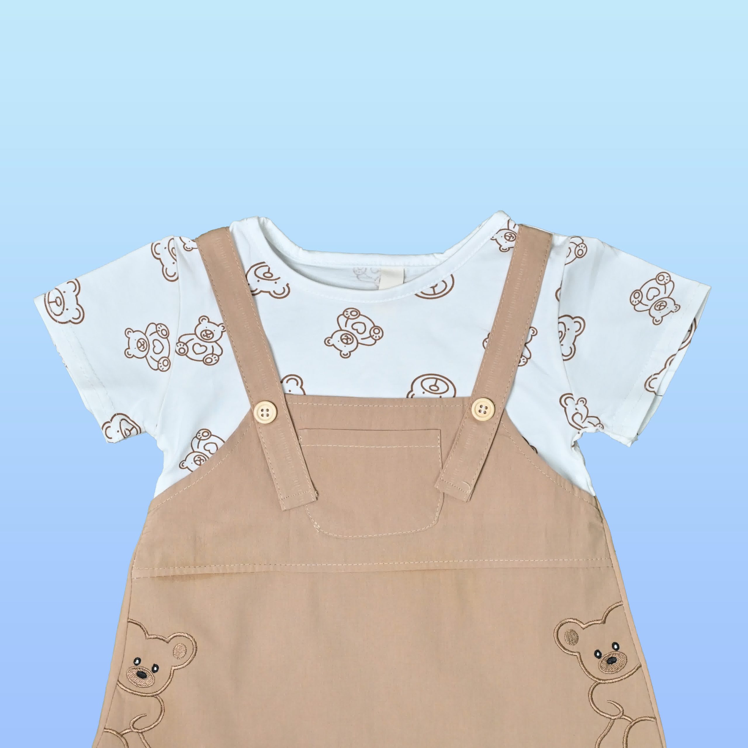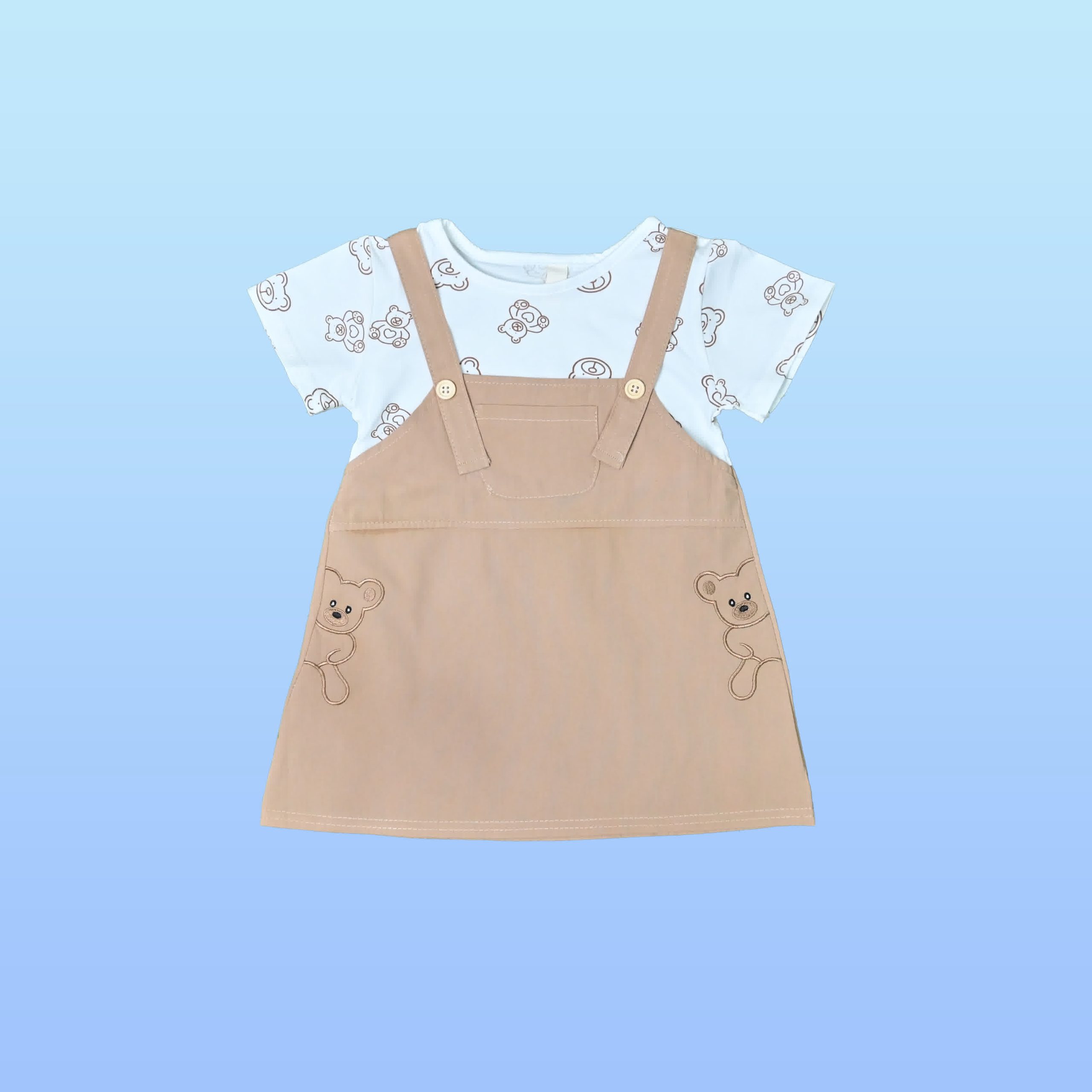 Adorable two-piece outfit designed for a young girl. The set includes a white short-sleeved t-shirt worn underneath a tan-colored overall dress. The t-shirt features a sweet pattern of light brown teddy bear faces scattered across the fabric. It has a simple round neckline. Layered over the t-shirt is a charming overall dress in a light tan or beige color. The dress has adjustable straps that fasten at the front with two round, light brown buttons on each side of the chest. The skirt of the overall dress is slightly A-line and features cute teddy bear face appliqués, one on each side near the hem. These appliqués are outlined with stitching. The overall impression is of a comfortable, playful, and stylish outfit perfect for a little one. Measurement: