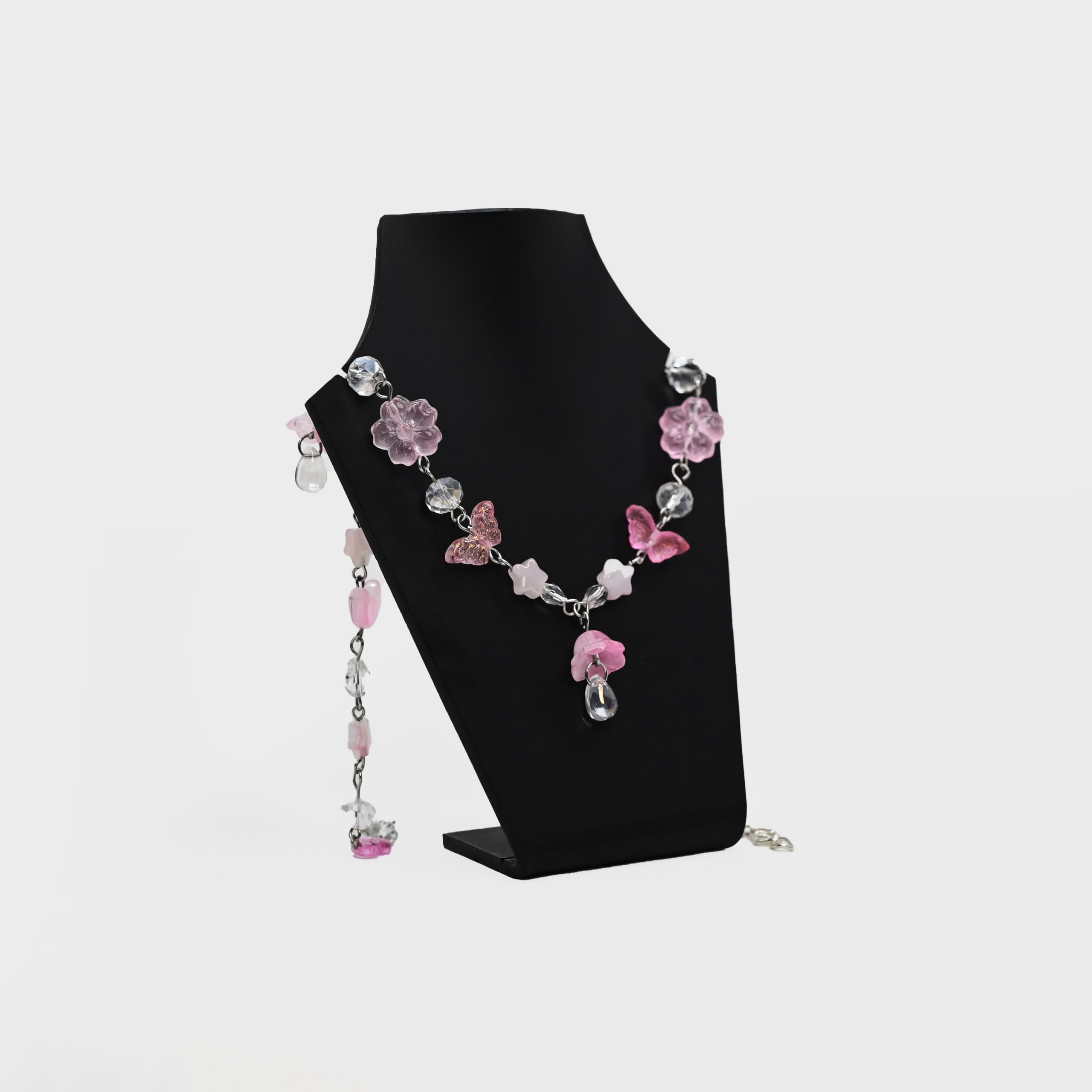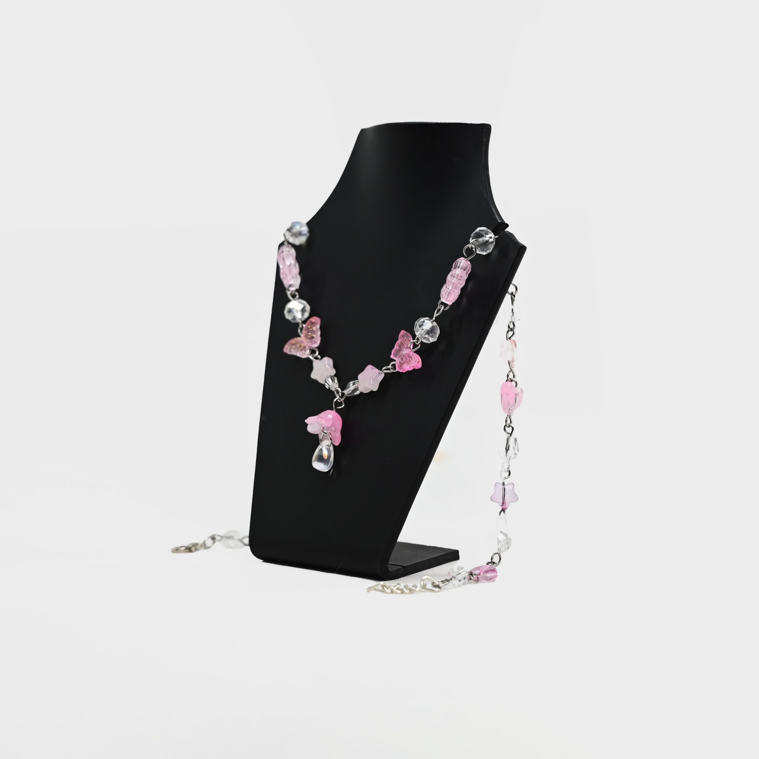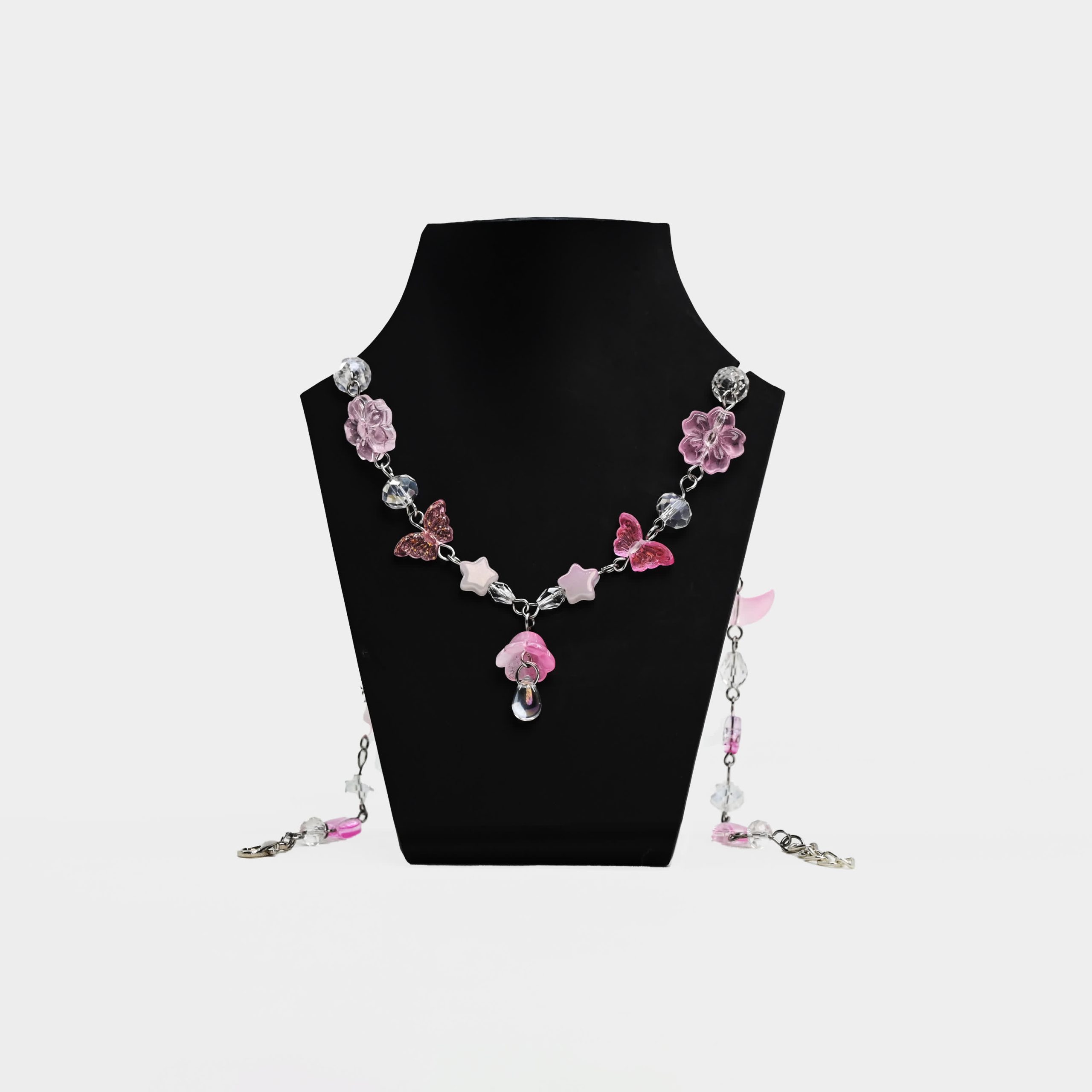 Accents: Glittery pink butterflies, star charms, flower beads, clear faceted crystals