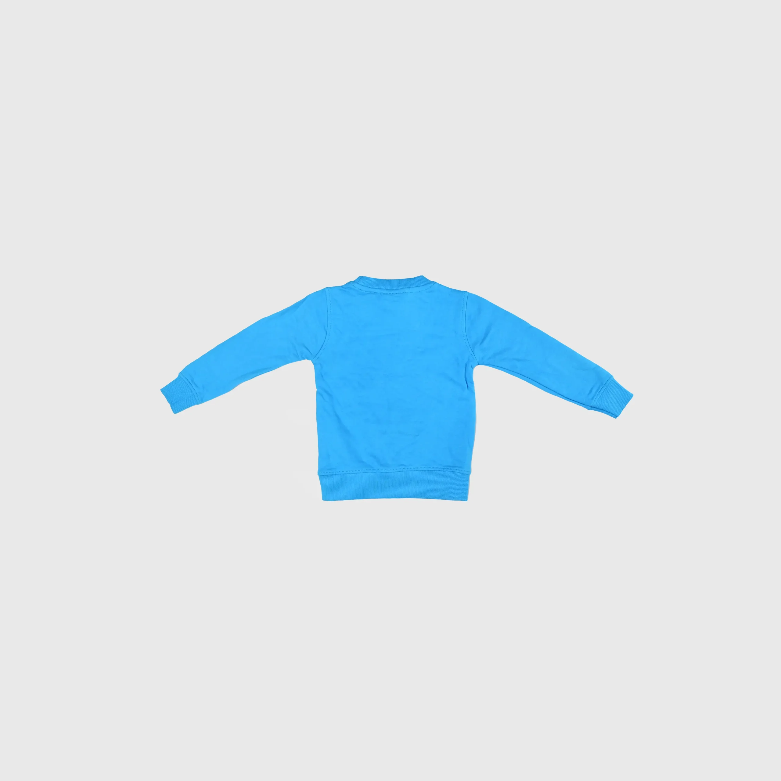 - Color:Â Bright, light blue fabric for the main body of the sweatshirt. The graphic features gold/yellow-colored fur, black eyes and nose, white sclera, a red mouth, and a red, hanging tongue.