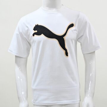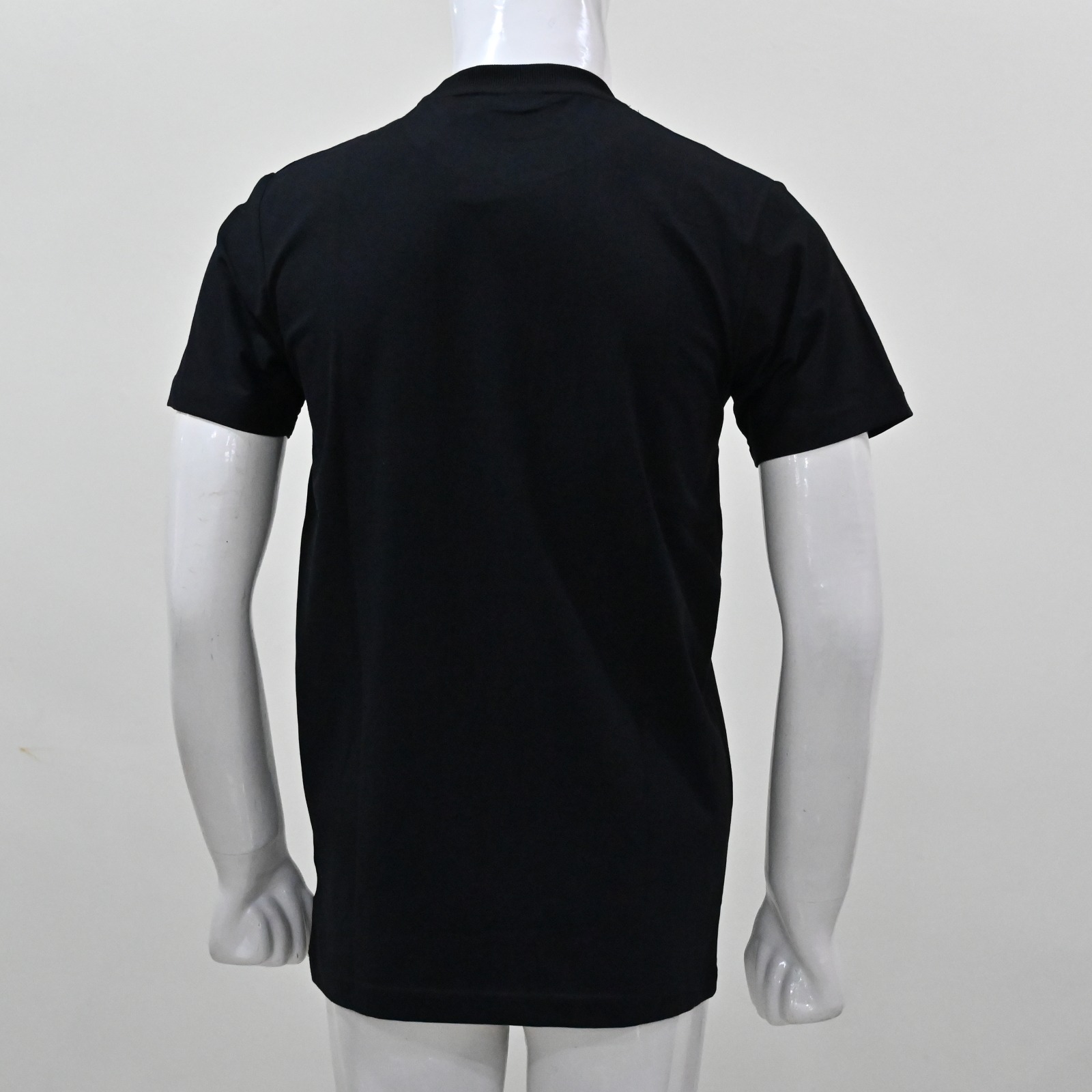 - The T-shirt features a classic crew neck made from a soft, comfortable knit fabric.
