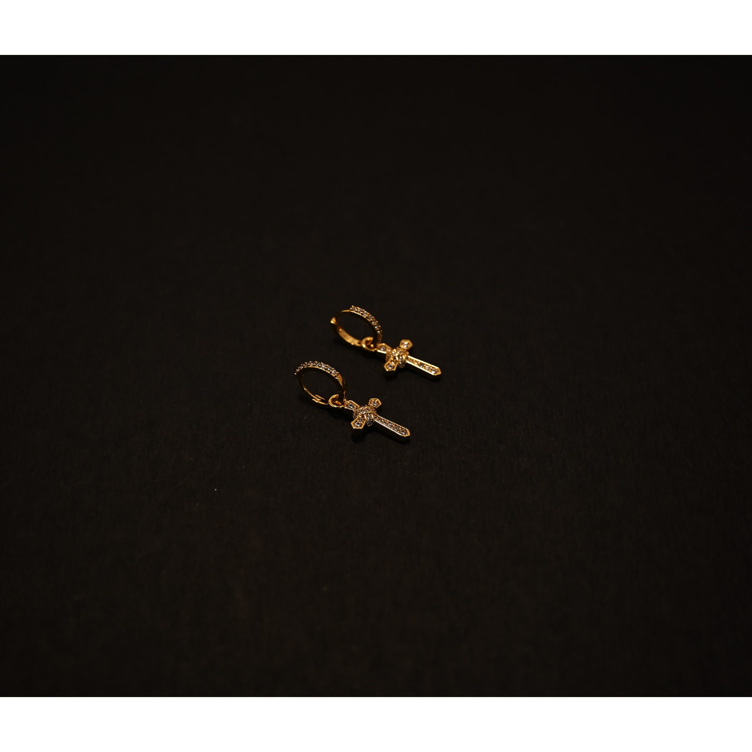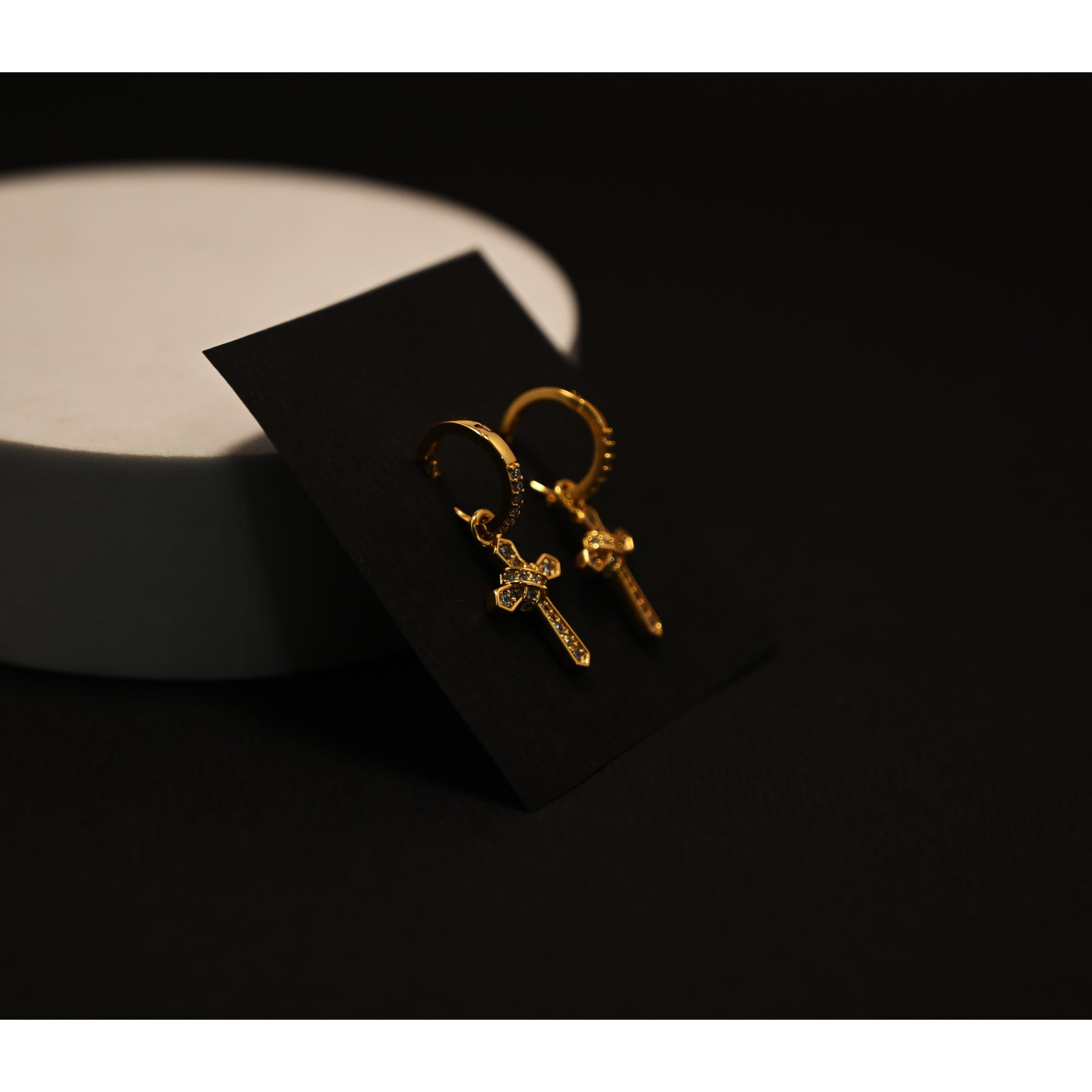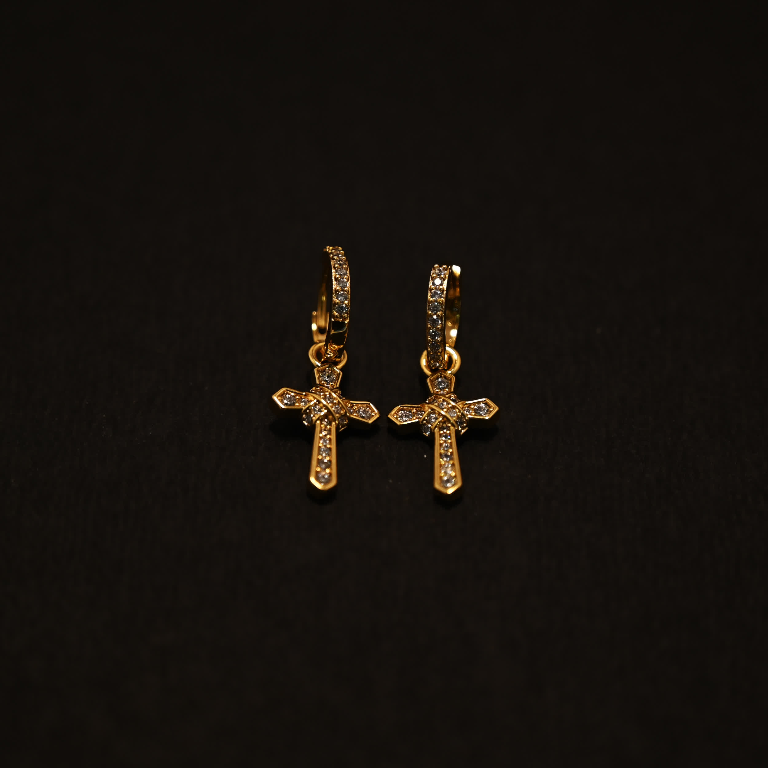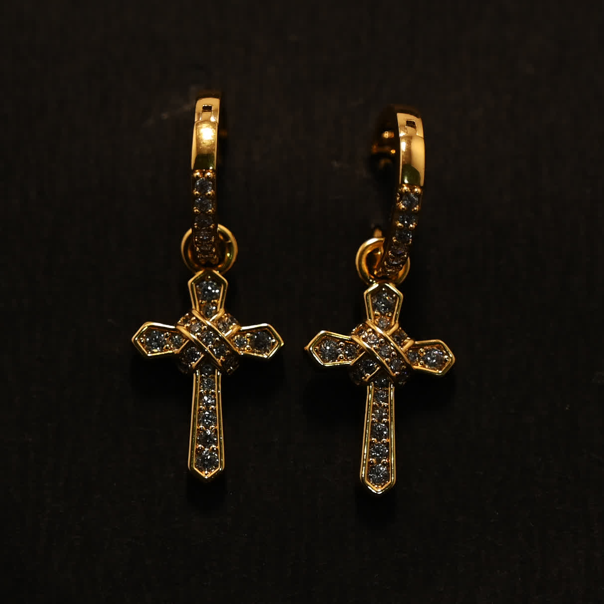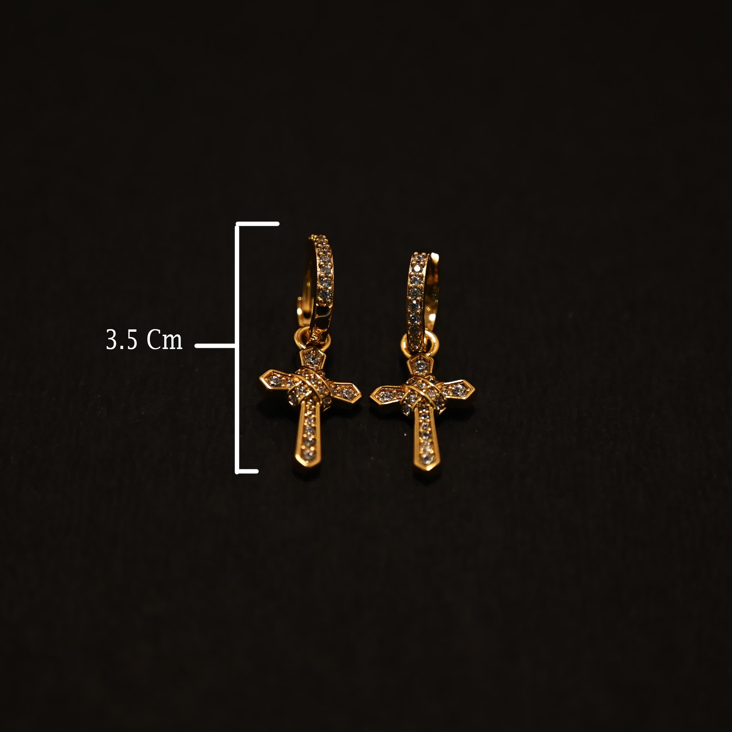 The Celeste Cross Drop Hoops blend timeless symbolism with modern elegance. Featuring a sleek gold hoop adorned with shimmering stones and a delicately detailed cross pendant, these earrings offer a graceful balance of faith, fashion, and sophistication. The 3.5 cm drop length adds just the right amount of movement, making them eye-catching yet refined.
