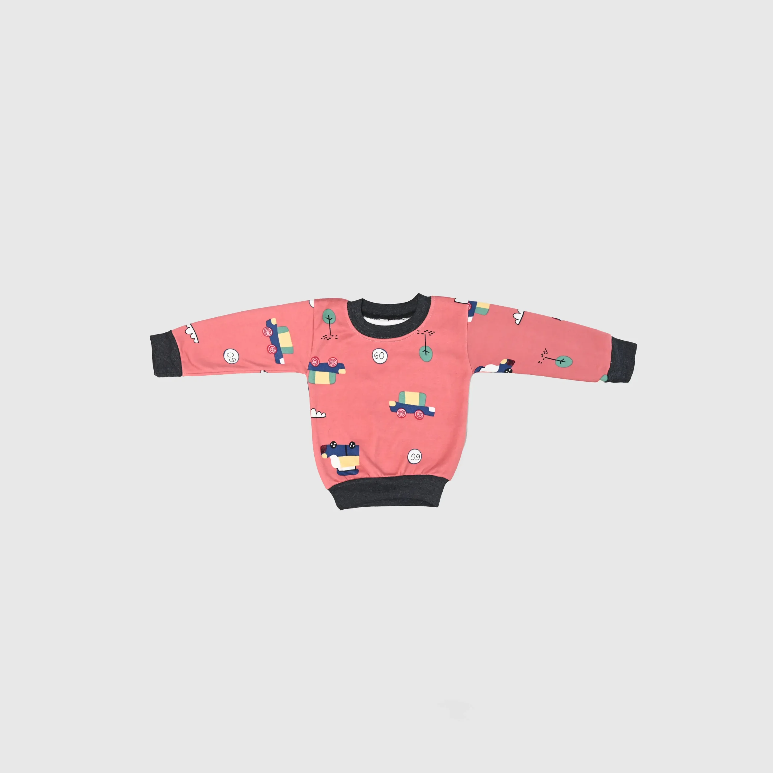 - Design:Â The set is a pink (or peach/dark peach) color with an all-over print of colorful vehicles. The top has dark grey/black trim on the cuffs, collar, and hem, which matches the trim on the pant cuffs.