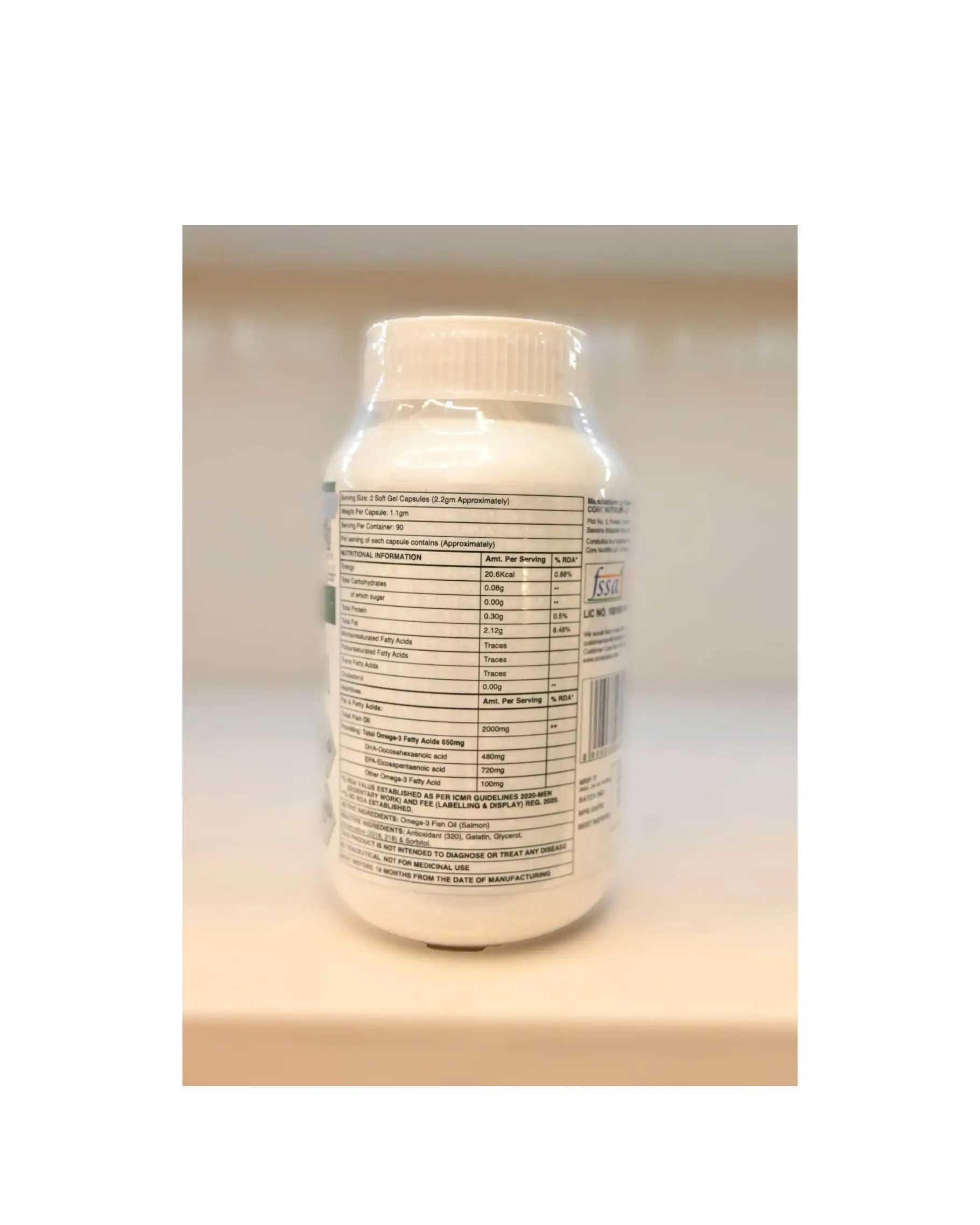Description Omega-3 Fatty Acids (EPA and DHA) otherwise called as Long Chain Polyunsaturated Fatty Acids (LCPUFA) are known as Essential Fatty Acids(EFA). The term ‘Essential’ means those substances that are crucial for good health. These are not synthesized by the body and hence must be supplemented through diet. Omega-3 Fatty Acids when adequately available in the body, are incorporated into the bilayer phospholipids cell membranes. This ensures the strength, integrity and fluidity of the cell membranes. Regular intake of Omega-3 decreases cardiovascular incidents and severity and lowers mortality by 30%.It also reduces the chances of Rheumatoid Arthritis. Brain is second in terms of fat content only to adipose tissue, the fat store of the body. 60% of the brain is fat and more than 60% of this fat is DHA. DHA supplementation is mandatorily recommended for pregnant women and lactating mothers for the benefit of new generation with improved IQ and Eye-Q. Corebolics Omega offers the EPA and DHA from purified standardized fish oil (Sardine) in soft gelatin capsules for dosage and user compliance. Corebolics Omega is safe in term of microbiological parameters, heavy metals, pesticide residues, dioxins, PCB’s etc found in raw fish oil and fish. About this item Fish oil doses vary depending on the goal of supplementation. For general health, 250mg of combined EPA and DHA is the minimum dose and can be obtained via fish intake. The American Heart Association recommends 1g daily If the goal of Supplementation is to reduce soreness, a 5g dose, spread over the course of a day, will be effective. The soft gel capsules should be taken preferably with meals as a dietary supplement, or as directed by Health Care Professionals.