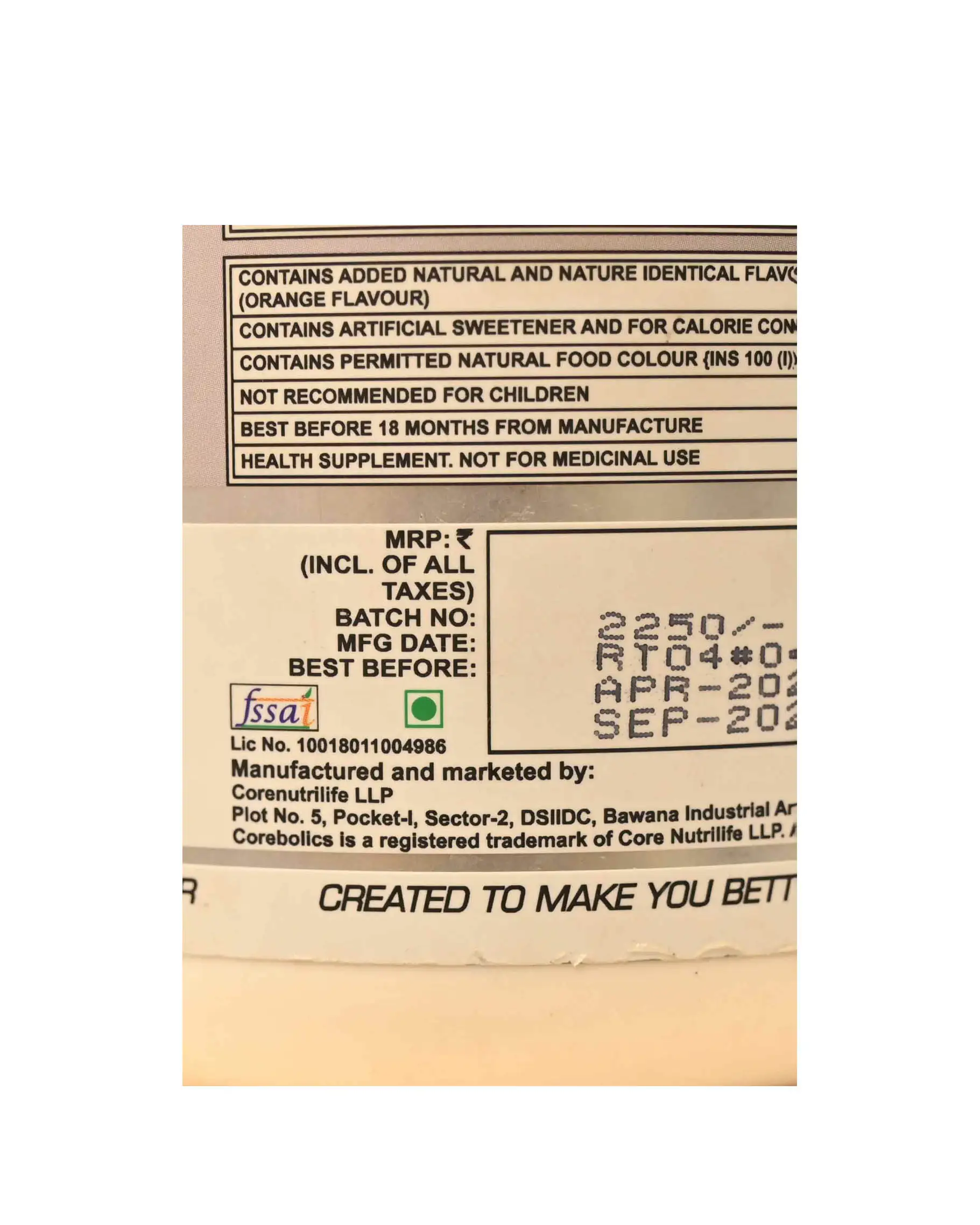 Product Details: What is Branched Chain Amino Acids? Branched Chain Amino Acids, (BCAAs) refer to three amino acids: Leucine, Isoleucine and Valine. Supplementing with BCAAs may promote muscle protein synthesis and increase muscle growth overtime. It can also be used to prevent fatigue in athletes. Leucine plays and important role in muscle protein synthesis while Isoleucine induces glucose uptake into cells. When it comes to “Quality Amino Acids”, Corebolics is setting new standards. At Corebolics, there is a commitment to quality, which is why we use the all new Instant fermented branched chain amino acids from vegan sources. Use the product elite athletes have known about for years. Make sure you keep RE-CORE as a part of your daily year-round supplement program. WHAT’S IN IT? 7gm BCAA 2.5gm Glutamine 1gm Citrulline 640mcg Vitamin B6 1057mg of Sodium chloride+potassium chloride+tri sodium citrate WHY COREBOLICS BCAA? By adding BCAAs to the mix, you can increase your intensity during workouts and elevate your performance. Ample energy throughout workout provides you with a blend of electrolytes that keep you hydrated along with 1g of citrulline malate that improves blood flow to your muscles to give you a better pump and more energy.  Why 2:1:1 ratio of BCAA? Although Leucine is the essential amino acid that aids in the production of muscle protein. However, studies show that Leucine supplementation alone does not meet all of the needs. Bcaa in a 2:1:1 ratio promotes muscle protein synthesis better than Leucine alone. Additionally, a 2:1:1 ratio aid in boosting energy output and reducing weariness. How does Leucine help? Leucine aids in triggering the synthesis of new muscle protein, which increases the amount of muscle protein and eventually promotes muscular growth. What is the role of Isoleucine? Faster muscle recovery, an increase in oxygen carrying capacity, and improved athletic performance are all benefits of isoleucine. What is the role of Valine? When one engages in any strenuous action, weariness and energy loss set in. The amino acid valine is responsible for delaying the onset of weariness. Valine also faces competition from serotonin. Serotonin levels that are higher during physical activity tell the brain that the body is exhausted, which lowers muscle power and endurance. Valine keeps the body more awake and energized so that it can do activity at a high level. How to Use Corebolics Recore? Mix 1 serving 15gm (1 scoop) with 6-8 oz. of cold water. RE-CORE can be consumed before training, between meals, Intra training or post workout to boost your amino acid intake. Use this product as a part of a proper diet and exercise program. For an ideal taste: 300-350ml For a strong taste: 250-300ml For a mild taste: 350-400ml When to Use Corebolics Recore? Corebolics Recore BCAAs can be consumed before, during, and after workouts to quickly raise blood levels of amino acids, encourage protein synthesis, and stop the degradation of muscle protein. If you believe your diet is not delivering enough BCAAs in the form of complete protein from meat, dairy, fish, eggs, etc., you can also take them between meals. Dope Free Product This product only contains the components specified on the label and is devoid of drugs and other compounds that are forbidden by the World Anti-Doping Agency as of 2017. Designed with premium grade, 100 percent pure, and banned substance-free BCAA in the perfect 2:1:1 ratio, Corebolics BCAA is a workout need (Leucine: Isoleucine: Valine). Faster nutrient absorption into the bloodstream, immediate results, and a delectable flavor help Ultra-Granulated BCAA Essentials fuel your activity. Athletes and experts alike prescribe BCAA Essentials because they increase muscle endurance and muscle protein synthesis, two factors that improve sports performance. During demanding workouts or activities, BCAA aids in maximizing energy production while also preventing weariness. BCAAs are also well known for helping to improve muscle rehabilitation and lessen pain in the muscles.