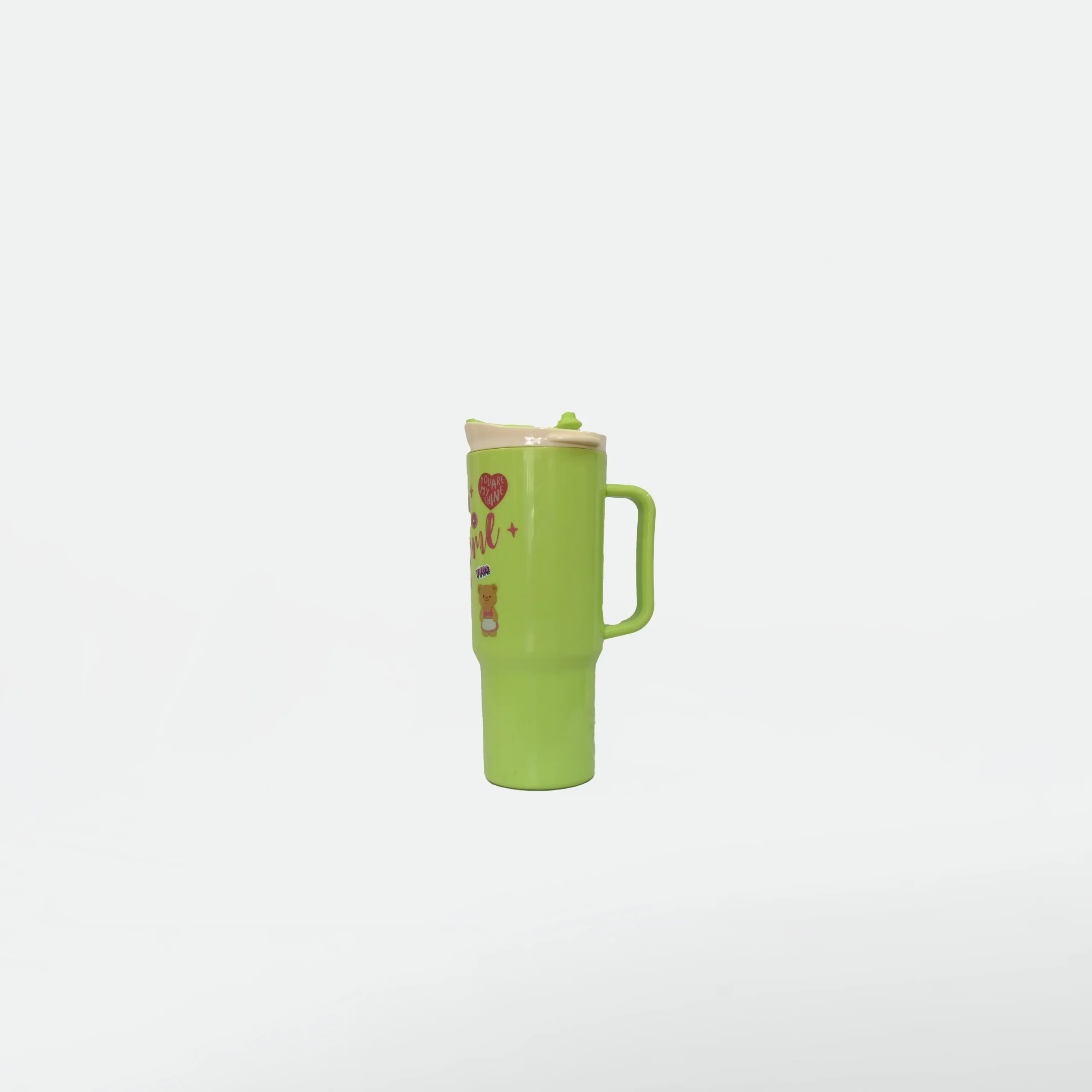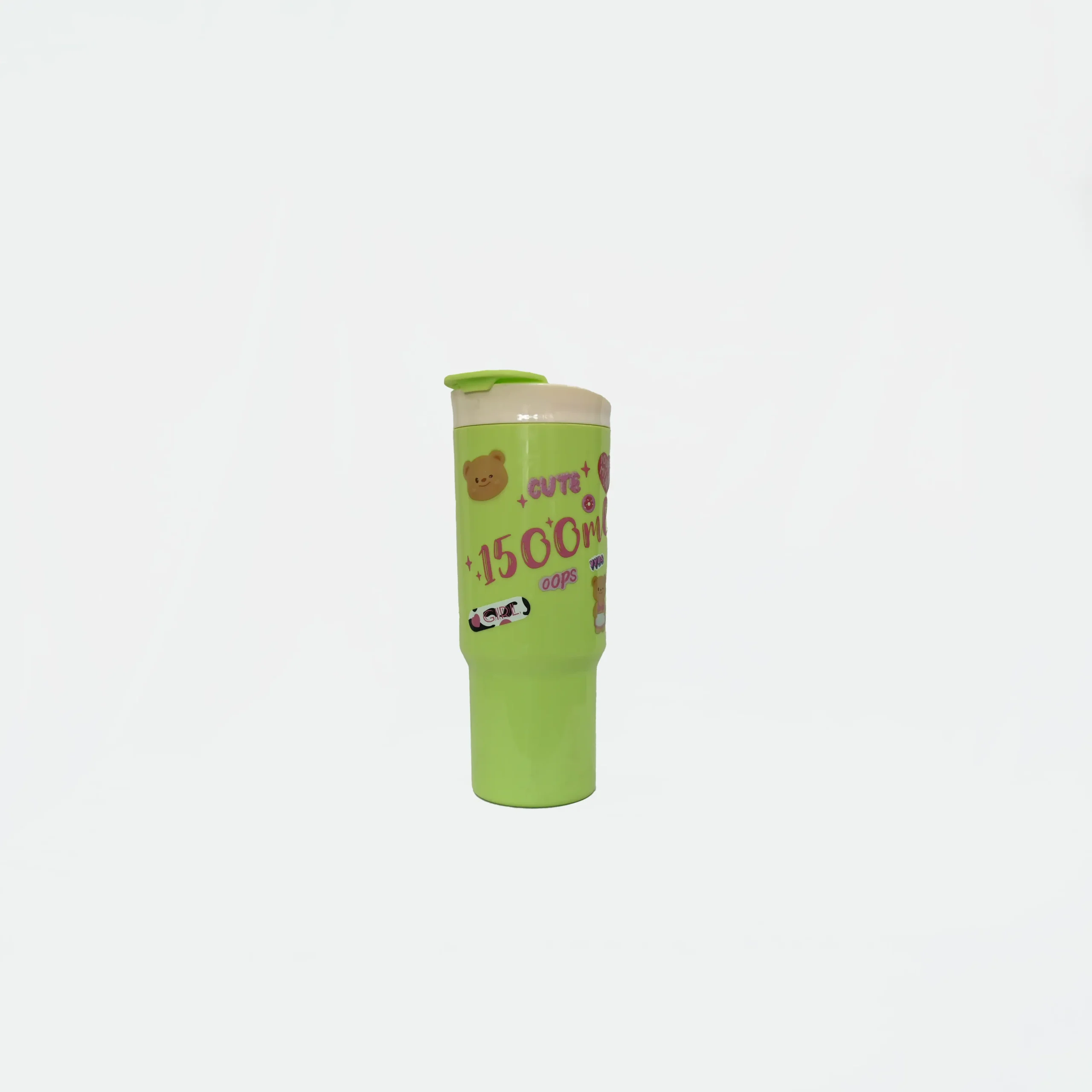 This is a large-capacity 1500ml sipper mug designed with a fun and playful aesthetic, perfect for kids, teens, or anyone who loves adorable accessories. The body of the mug is a bright light-green color, giving it a cheerful and refreshing look. It features cute bear-themed prints, colorful text, and fun doodle-style graphics that enhance its playful charm.