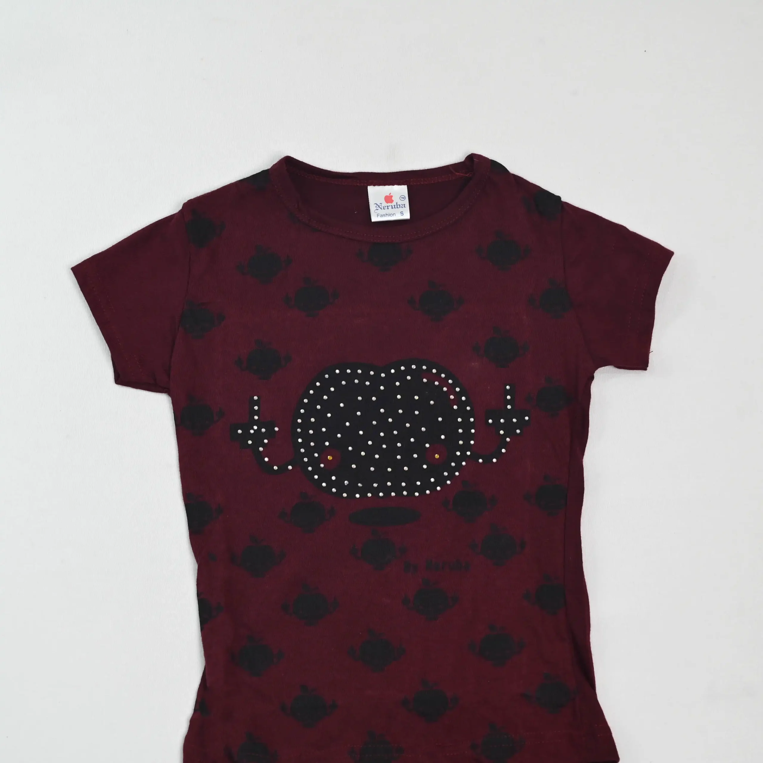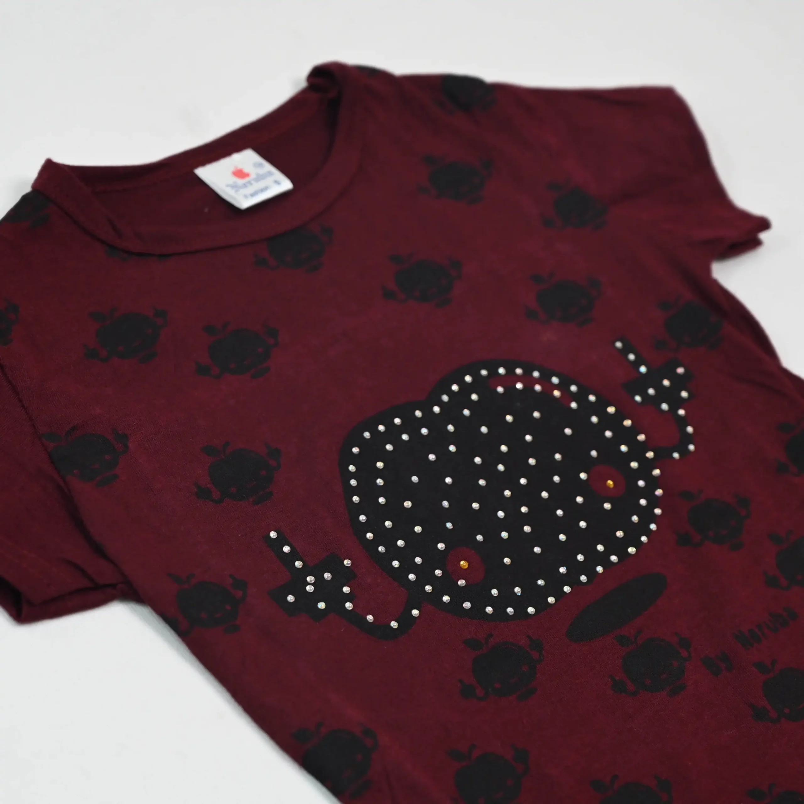 This adorable t-shirt features a vibrant maroon background with a playful all-over print of cute cartoon characters. The design is centered around a larger cartoon character with a sparkling rhinestone embellishment, adding a touch of glitz and glamour. The sleeves are short and the neckline is a classic crew neck.