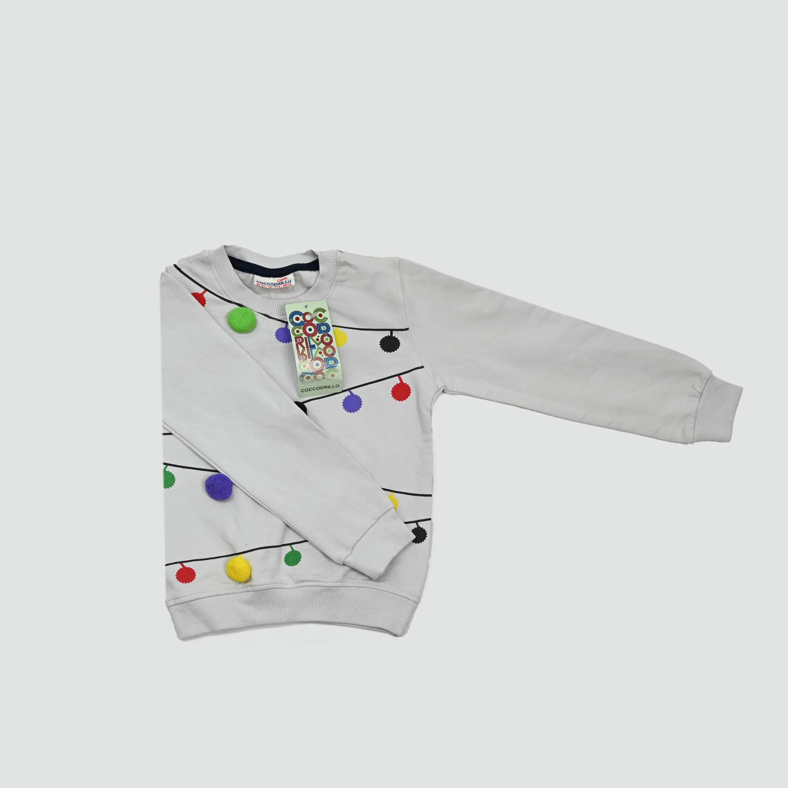Bring cheerful vibes to your little one’s winter wardrobe with our FestiGlow Kids’ Pom-Pom Light Sweatshirt! Designed in soft, cozy fabric, this white sweatshirt features a playful string-light pattern decorated with colorful 3D pom-poms — perfect for holiday fun or any day that needs a little sparkle. With its comfortable fit and festive charm, it’s a must-have for kids who love to shine bright all season long.