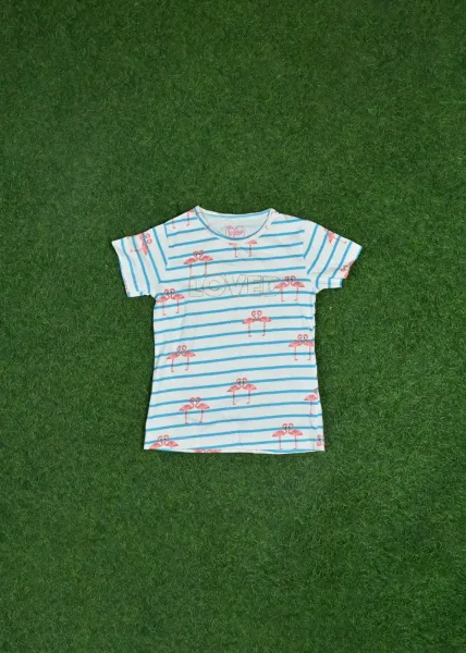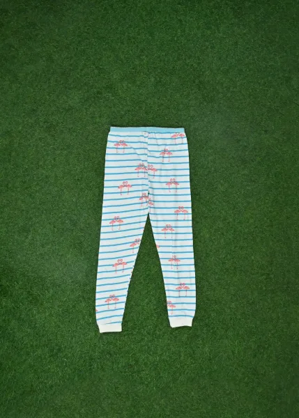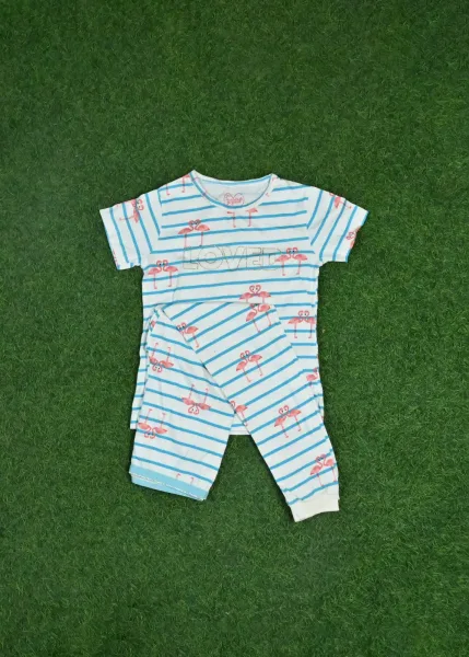- Pattern: Both the top and pants have a blue and white striped pattern with pink flamingos scattered throughout.