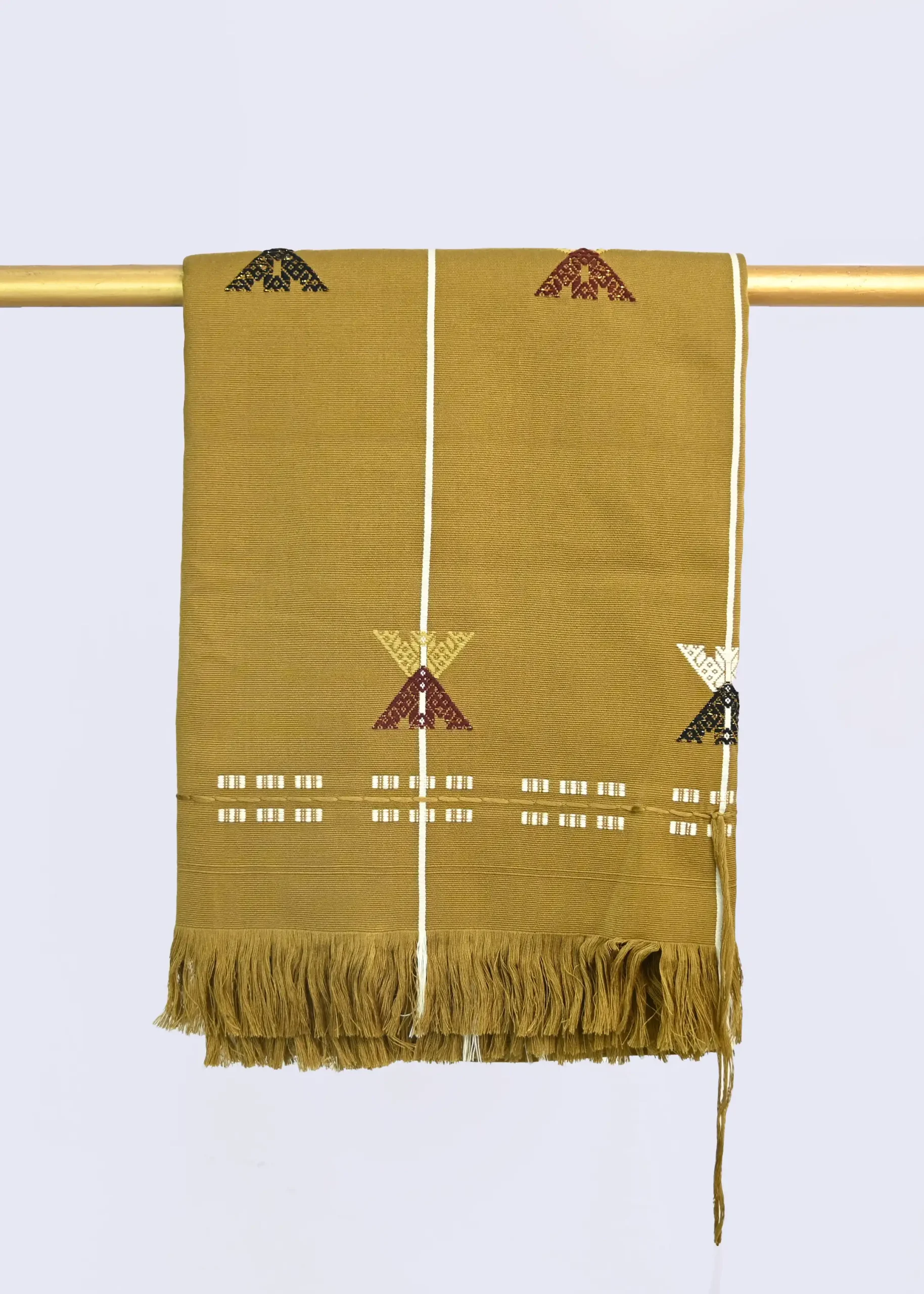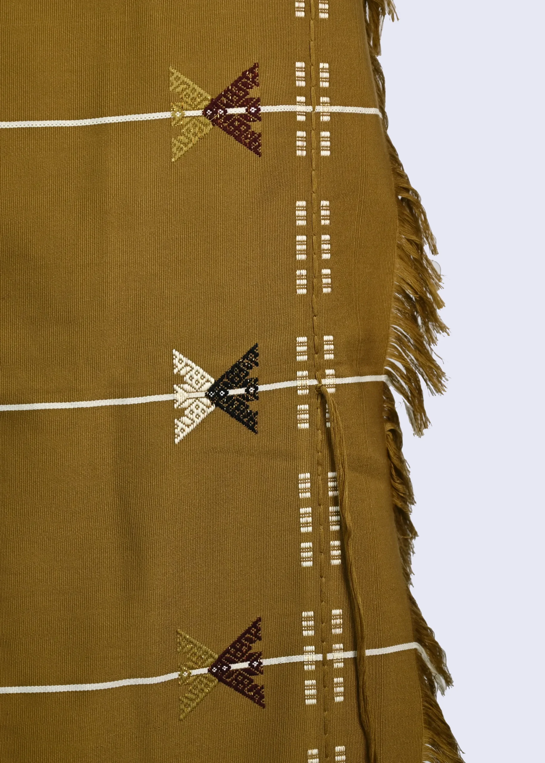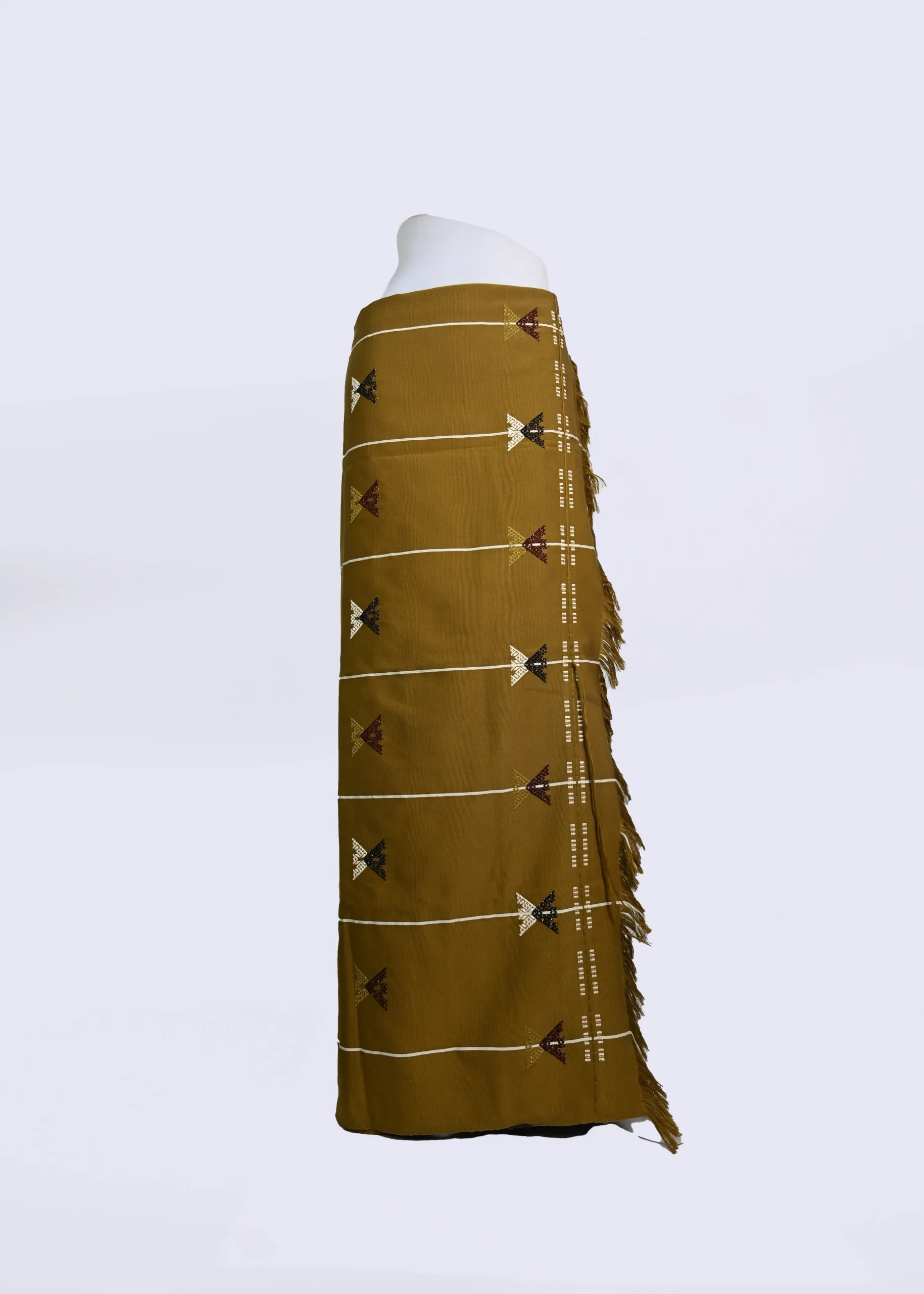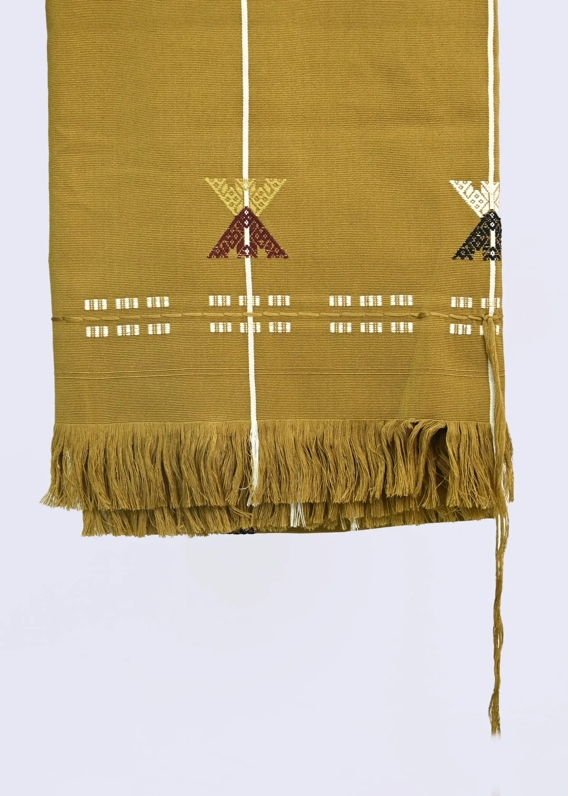 Celebrate timeless heritage with the Golden Harvest Wrap Skirt, a beautifully crafted traditional garment that blends cultural artistry with everyday elegance. This skirt features a rich mustard-golden base color adorned with finely woven geometric motifs in contrasting tones, reflecting authentic Mizo textile traditions. The horizontal stripe detailing and symbolic patterns add depth and visual interest, while the delicate fringed edge enhances its handcrafted charm.