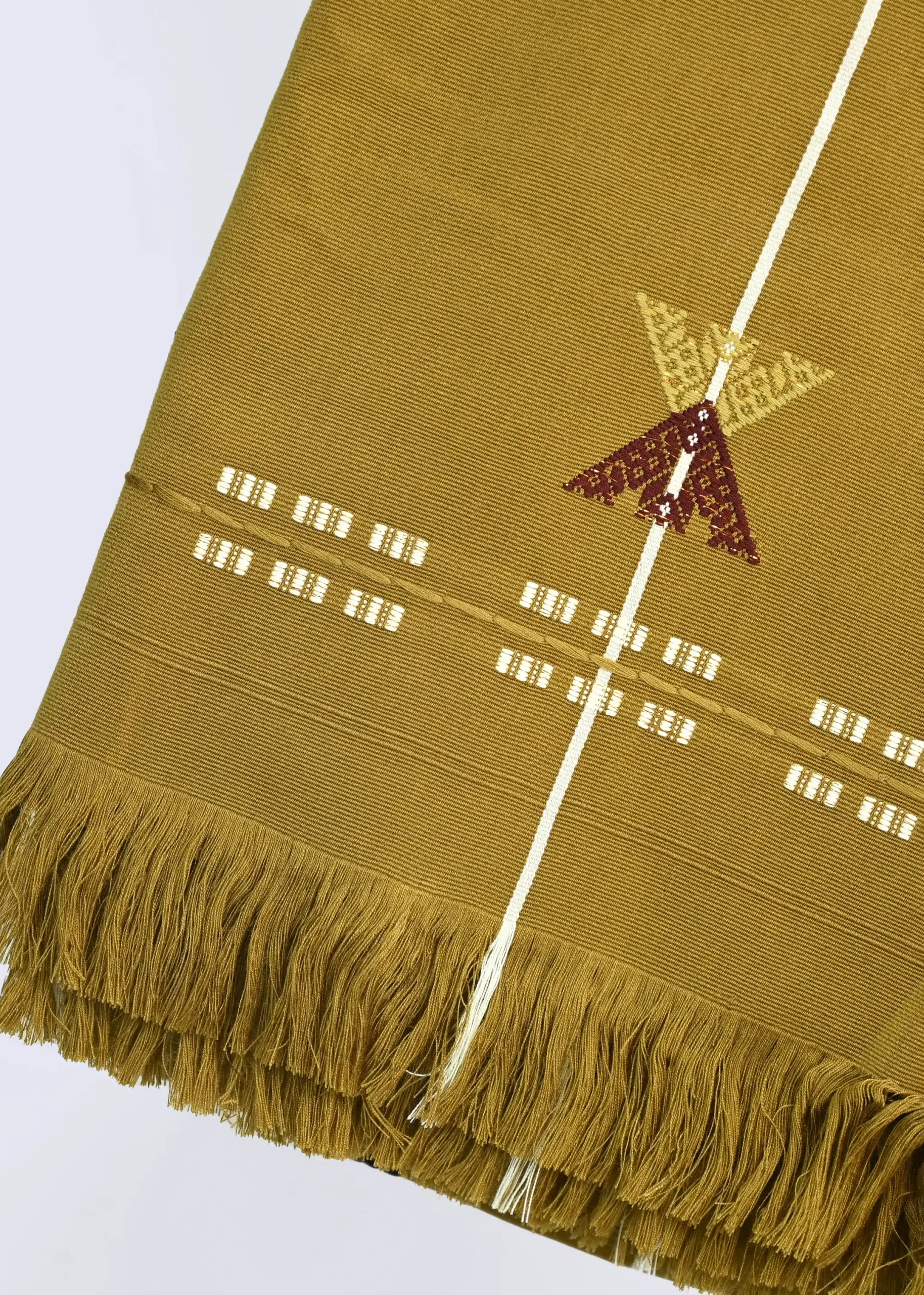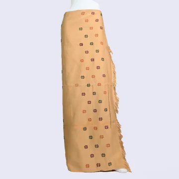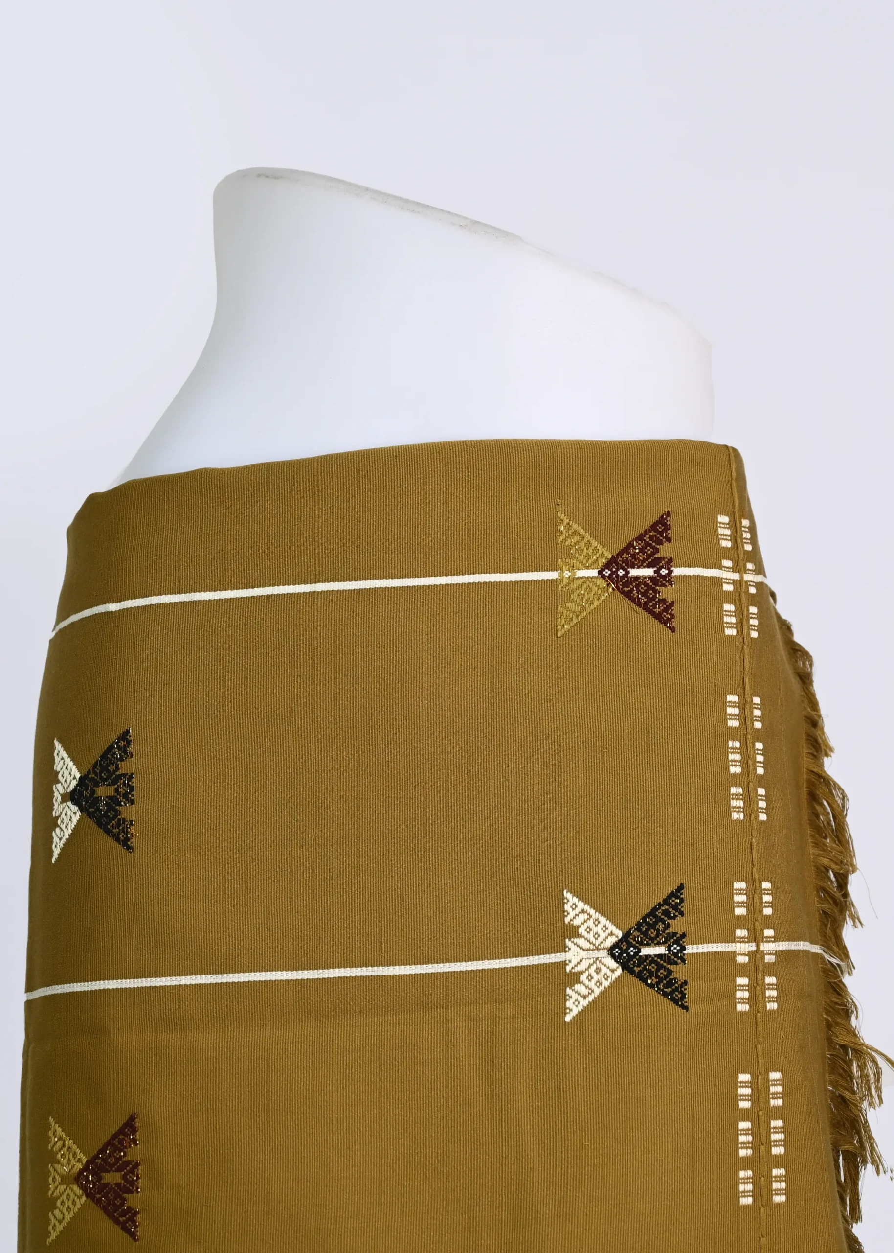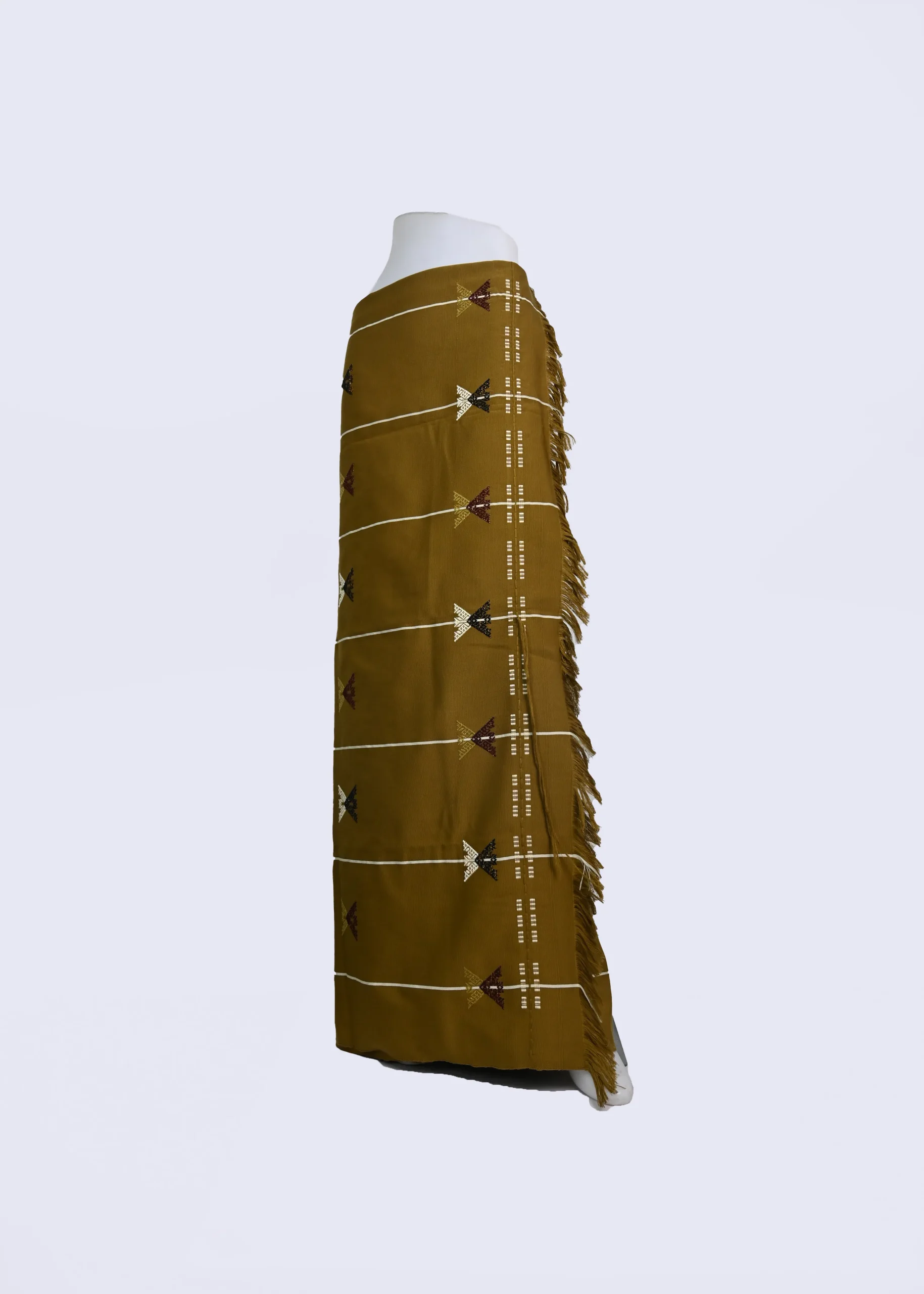 Celebrate timeless heritage with the Golden Harvest Wrap Skirt, a beautifully crafted traditional garment that blends cultural artistry with everyday elegance. This skirt features a rich mustard-golden base color adorned with finely woven geometric motifs in contrasting tones, reflecting authentic Mizo textile traditions. The horizontal stripe detailing and symbolic patterns add depth and visual interest, while the delicate fringed edge enhances its handcrafted charm.