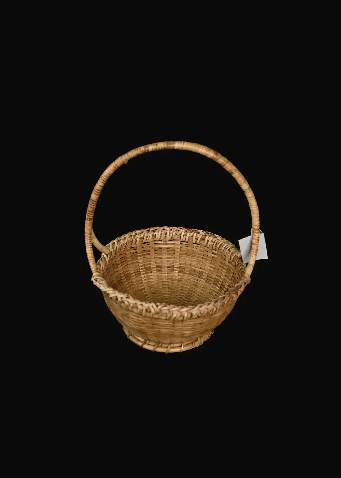 Woven basket made from natural materials. The basket has a circular base and a curved handle. It is likely handmade, as evidenced by slight variations in the weaving pattern. The basket appears to be empty, but it could be used to hold a variety of items, such as fruits, vegetables, or flowers.