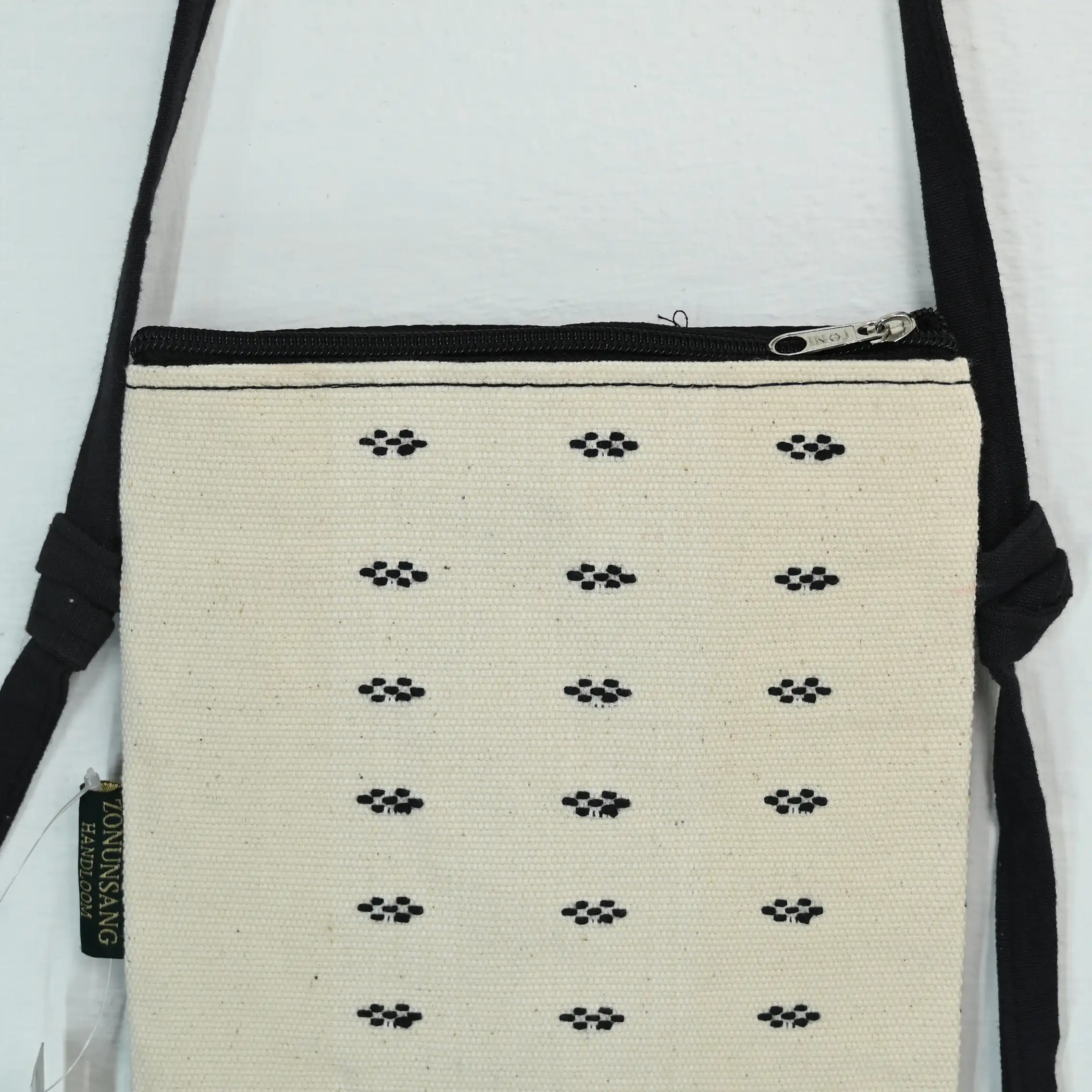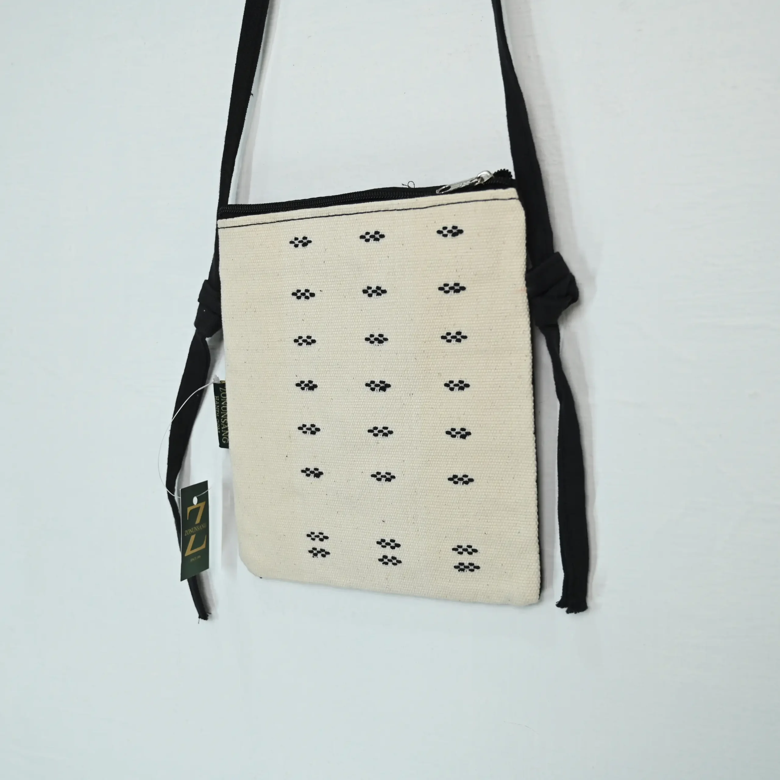 Elevate your everyday essentials with a touch of Northeast Indian heritage. This minimalist sling bag is meticulously hand-loomed using traditional Mizo weaving techniques. Featuring a clean, off-white canvas accented by signature black geometric motifs, it strikes the perfect balance between cultural artistry and modern functionality.