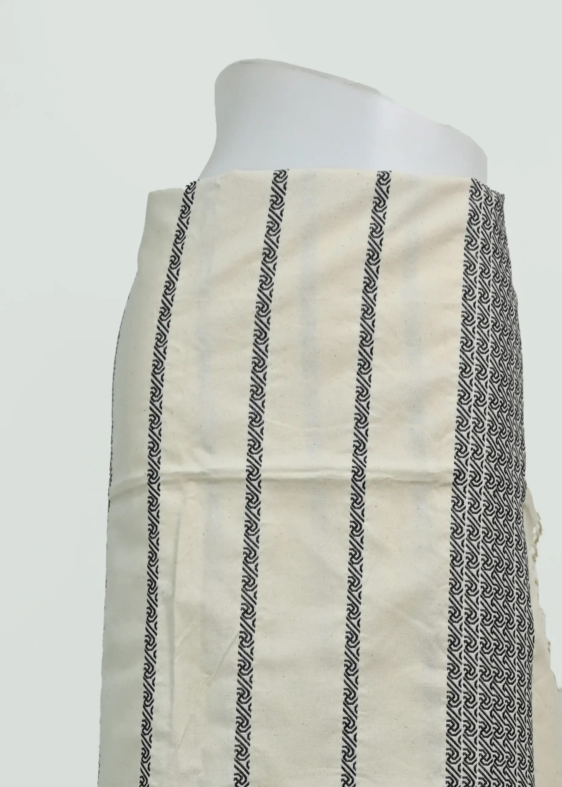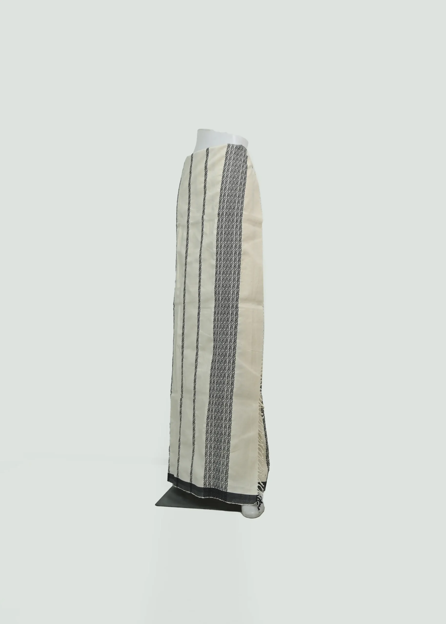 Expertly machine-woven from pure cotton, this puan delivers a smooth, durable finish with excellent drape while staying true to the classic cultural design. The striking contrast features wide vertical black stripes filled with intricate, symmetrical kawkpuizikzial patterns (entwined leafy vines in black-on-black weave for depth), framed by thinner lines and finished with fringed edges for an authentic touch.