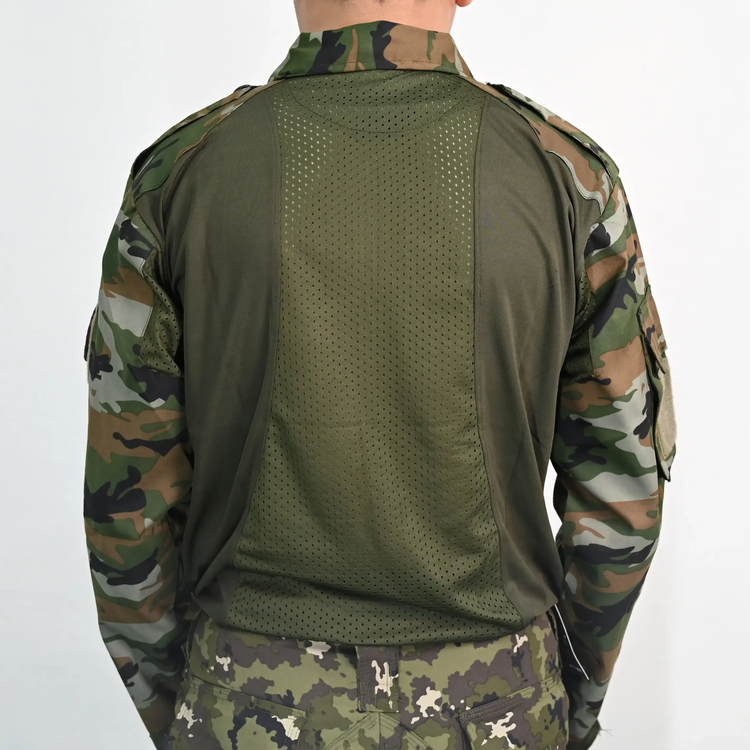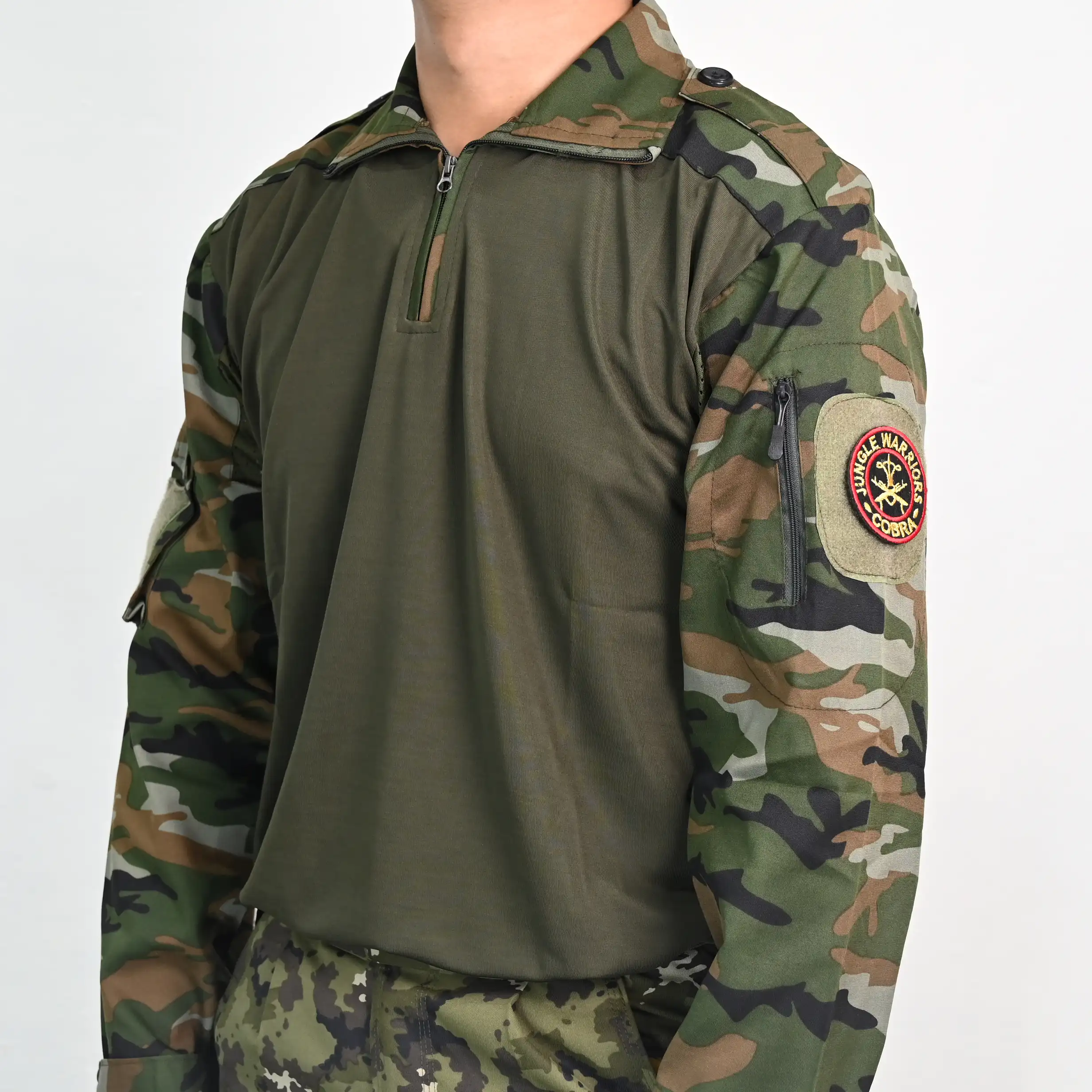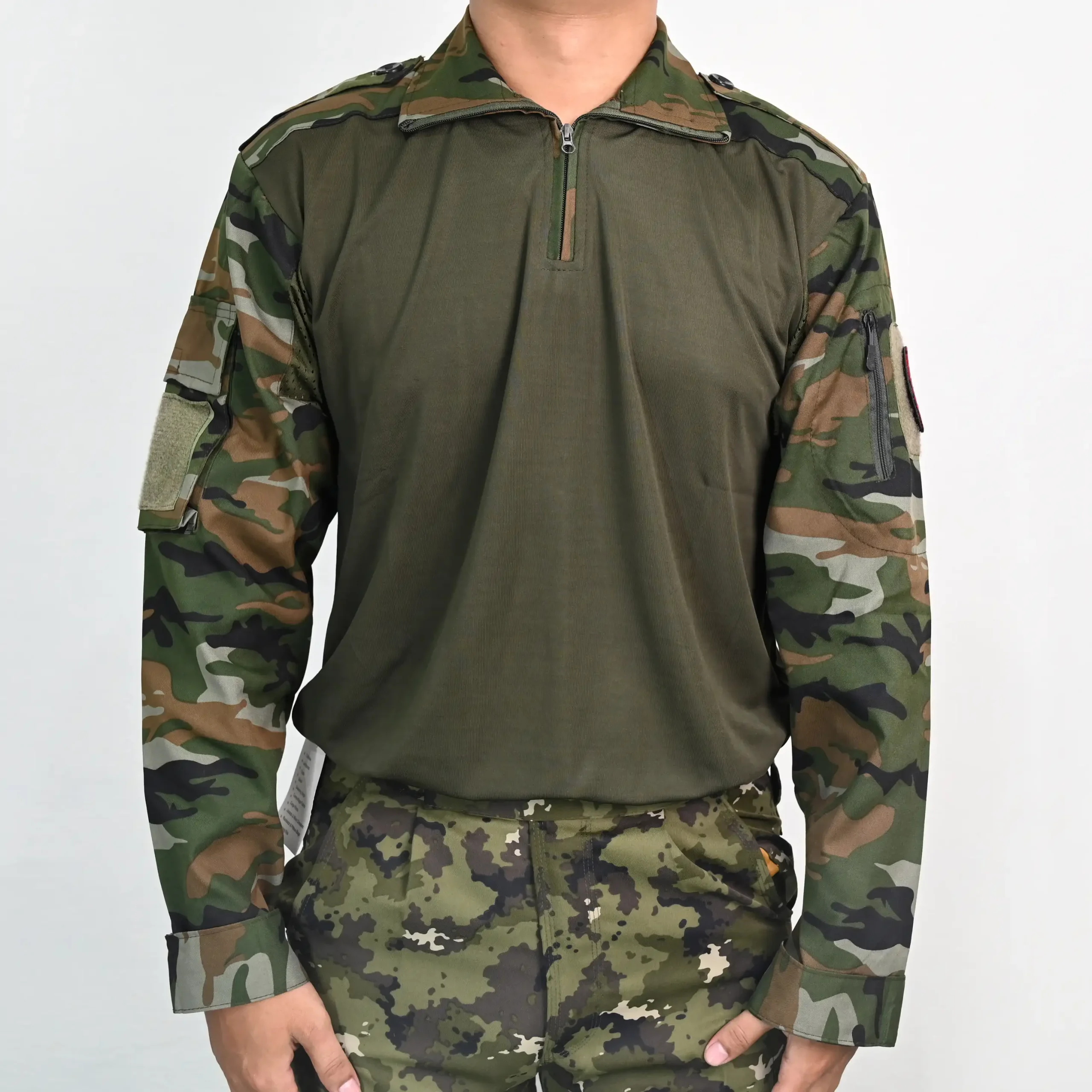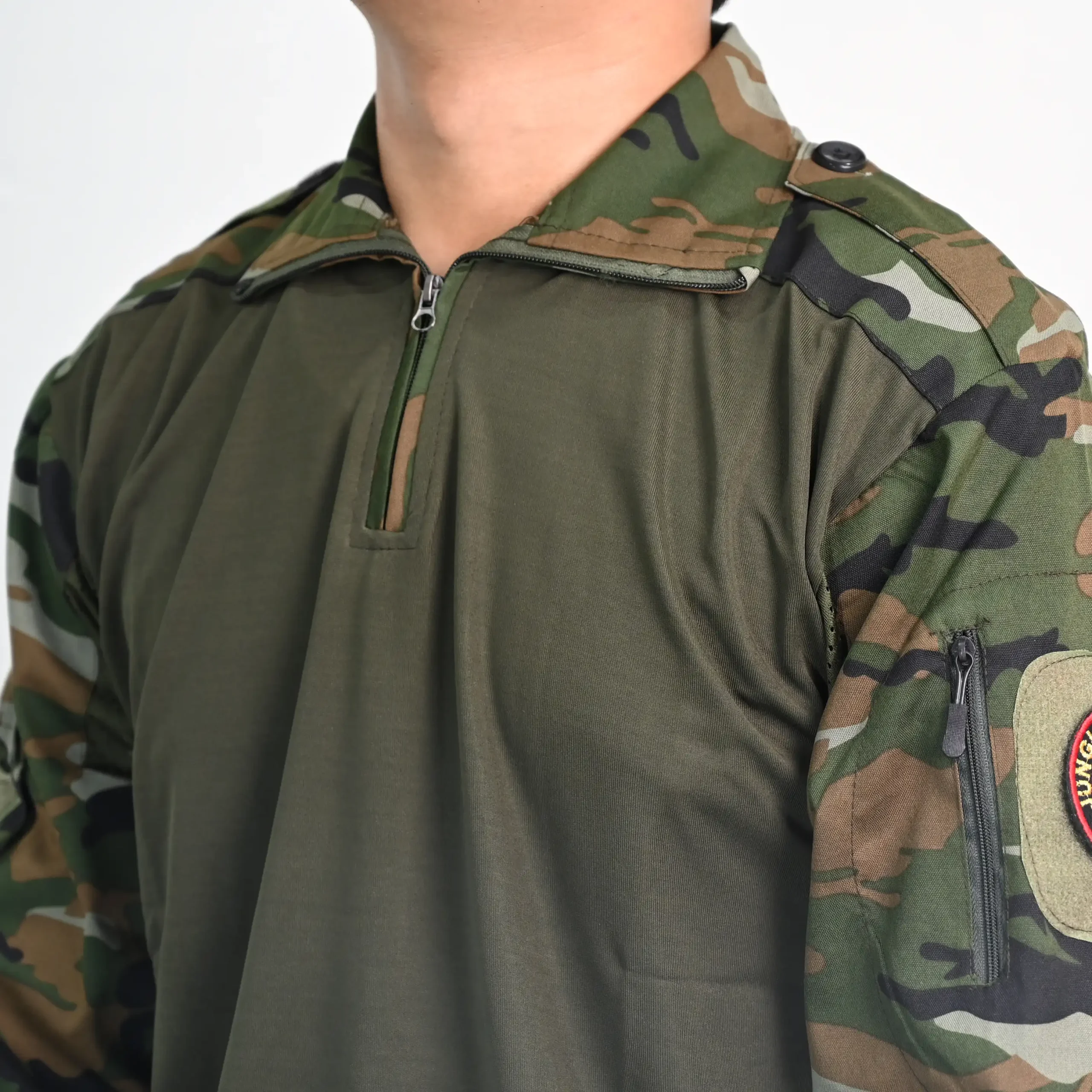 Military Style Combat T-Shirt, Camouflage Sleeves, Half Zip Collar, Olive Green