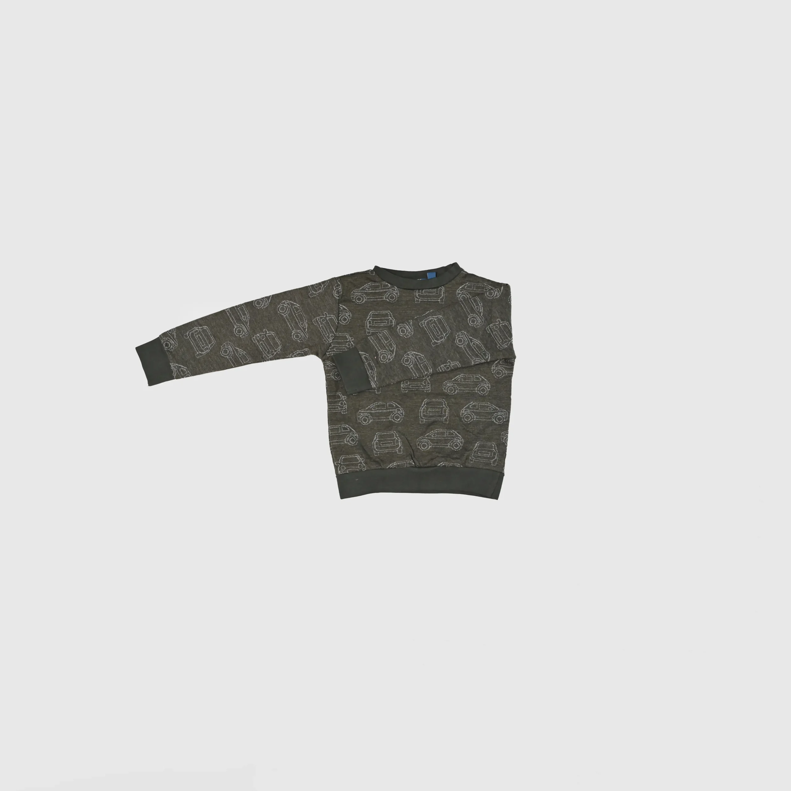 Keep them cozy and stylish with this unique “Urban Cruisers” sweatshirt. Crafted from a soft, comfortable fleece or cotton-blend material, this top provides warmth without compromising on style. The modern dark olive green or charcoal base is covered in a continuous, fine white line-art pattern of various cars and trucks, making it a sophisticated yet playful choice for young vehicle enthusiasts.