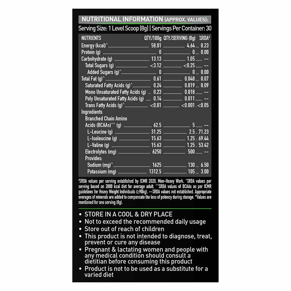Packed with necessary BCAA: Each serving of MuscleBlaze BCAA pro contains 5 grams of branched chain amino acids. The BCAAs leucine, isoleucine and valine are found in the 2:1:1 ratio which is most beneficial to your muscles.