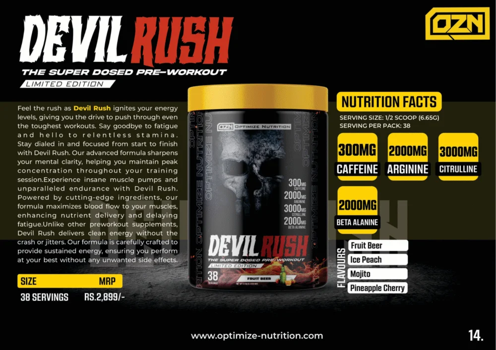 Devil Rush pre-workout is a specialized supplement formulated to enhance physical performance by increasing energy, focus, and endurance during workouts. The key ingredients of Devil Rush include beta-alanine, caffeine, citrulline malate, and branched-chain amino acids (BCAAs). Each of these components plays a critical role in optimizing workout efficiency and achieving optimal results.