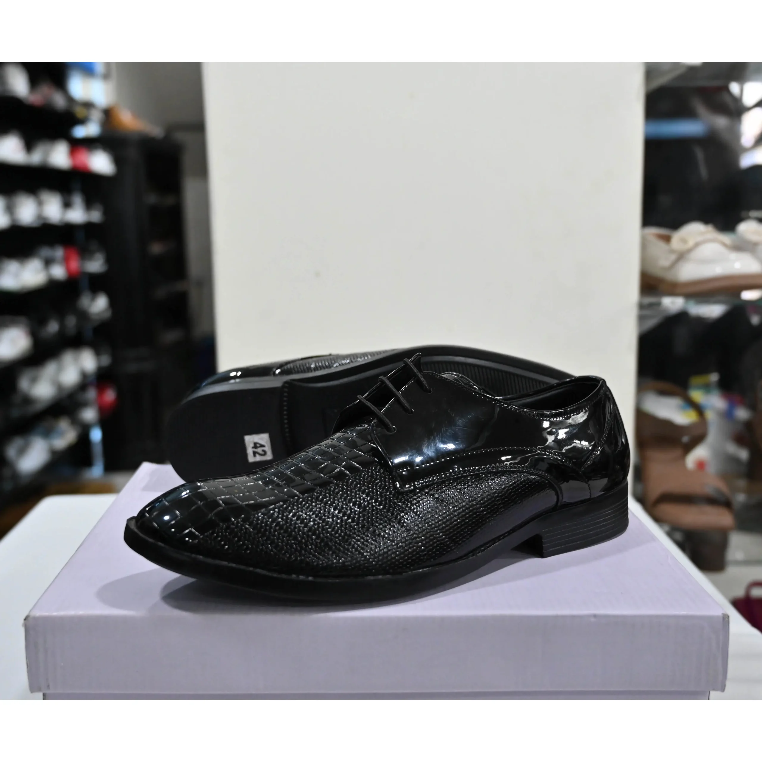 The box behind the shoes suggests they are new and ready for display or purchase.