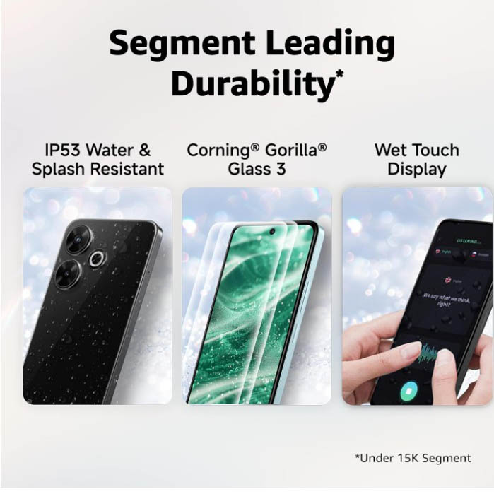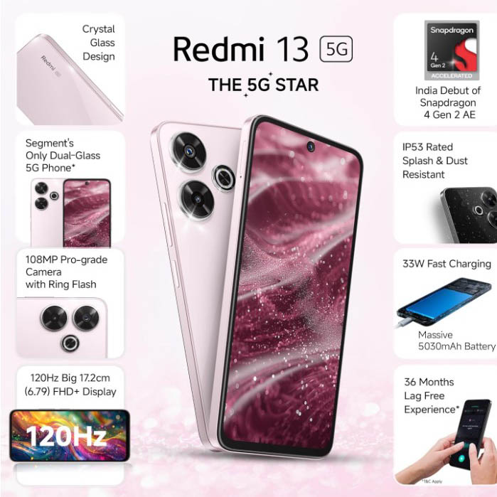 Large 17.24cm FHD+ 120Hz AdaptiveSync display with Corning Gorilla Glass 3 Protection, TÜV Rheinland low blue light, TÜV flicker-free, TÜV Circadian Friendly, Wet finger touch display Processor: Qualcomm Snapdragon 4 Gen2 Accelerated Edition Octa-core processor for high performance ; Up to 2.3GHz; Android 14 with Xiaomi HyperOS, Upto 12GB RAM including 6GB Virtual RAM Camera: 108MP f/1.75 Dual camera with 3X In-Sensor Zoom, classic film filters, Portrait, Night Mode,HDR, 108MP mode, Time-lapse, Google lens, Macro Video | 13MP Selfie camera Battery: 5030 mAh large battery with 33W fast charger in-box and Type-C connectivity Side Fingerprint Sensor, 3.5mm Jack, IR Blaster, IP53