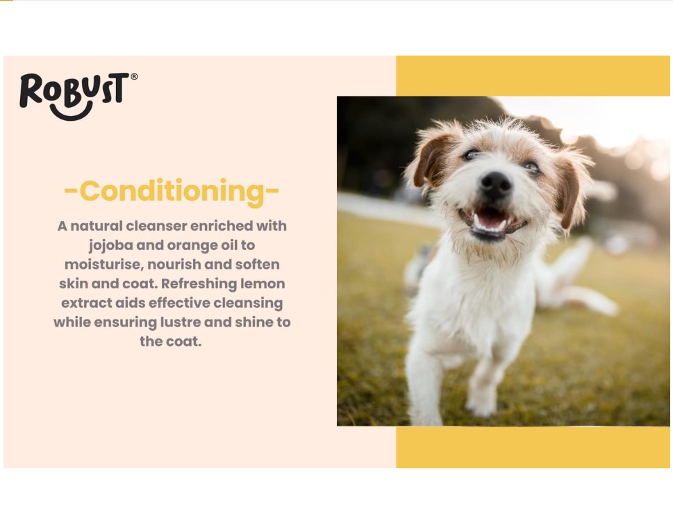 - BETTER & STRONGER: Robust Conditioning Shampoo is formulated with the highest quality ingredients, ensuring it is better and stronger than other shampoos in the market. The formula contains Lemon and Orange Oil, known for their natural cleansing and deodorizing properties. This means that you can be assured that your pet will smell fresh and clean, without any harsh chemicals or synthetic fragrances.