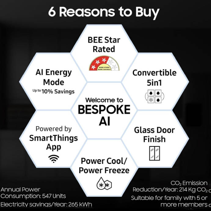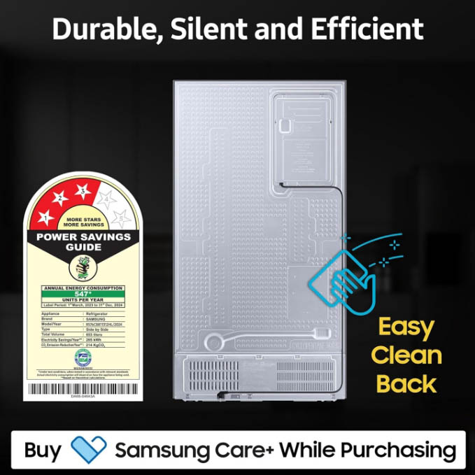 * Available on Android and iOS devices. A Wi-Fi connection and a Samsung account are required.** Available for specific models through wifi update. Test result is based on internal test. Results may vary depending on the usage condition and pattern.*** By optimizing compressor speed and operation and adjusting the set of Freezer temperature.