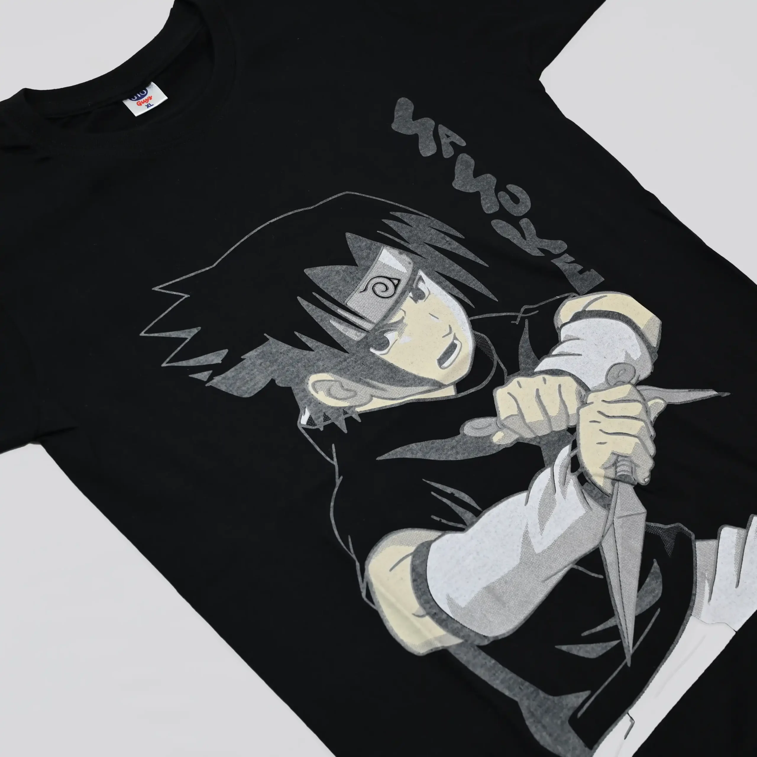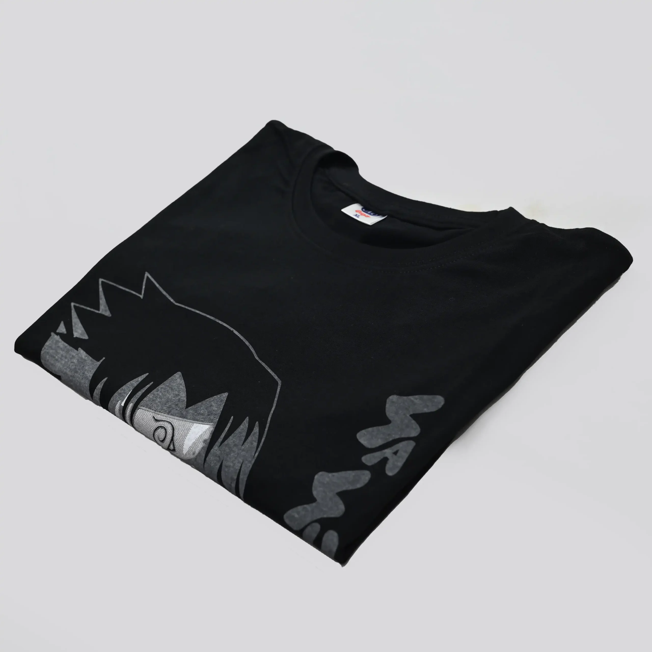 - Color: The t-shirt is black, and the image of Sasuke is printed in shades of gray.