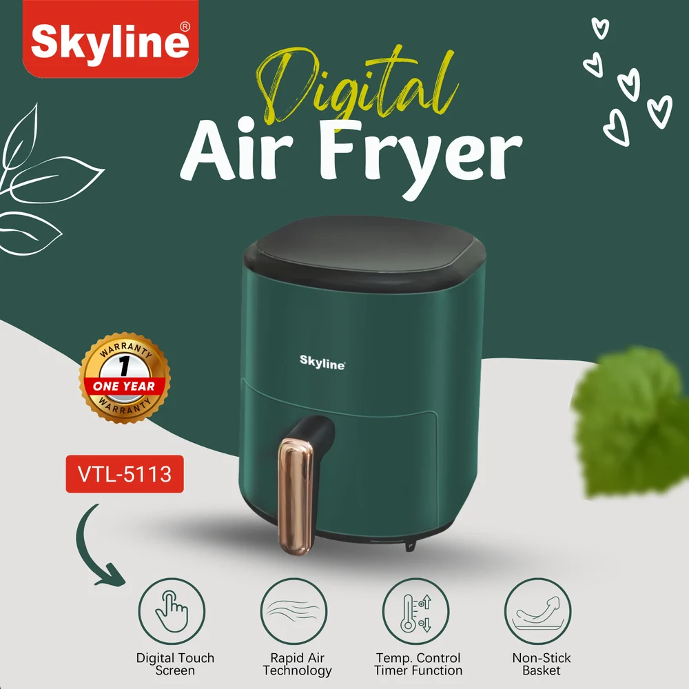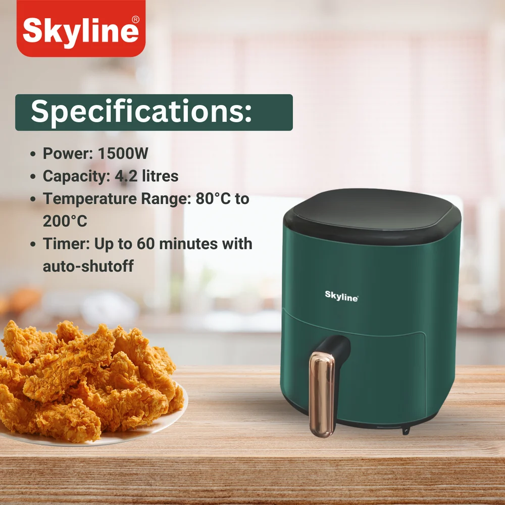 Revolutionize your kitchen with the Skyline Digital Air Fryer. With 1500 watts of power and a spacious 4.2-litre capacity, this air fryer allows you to cook your favorite meals using little to no oil. Its digital interface offers precise control, making healthy cooking easier and more convenient than ever.