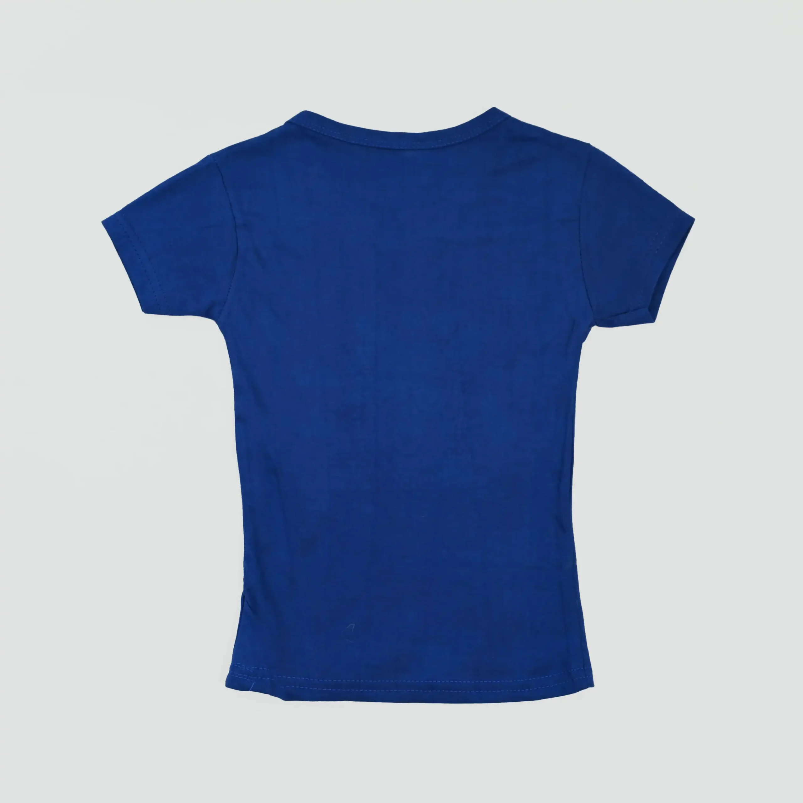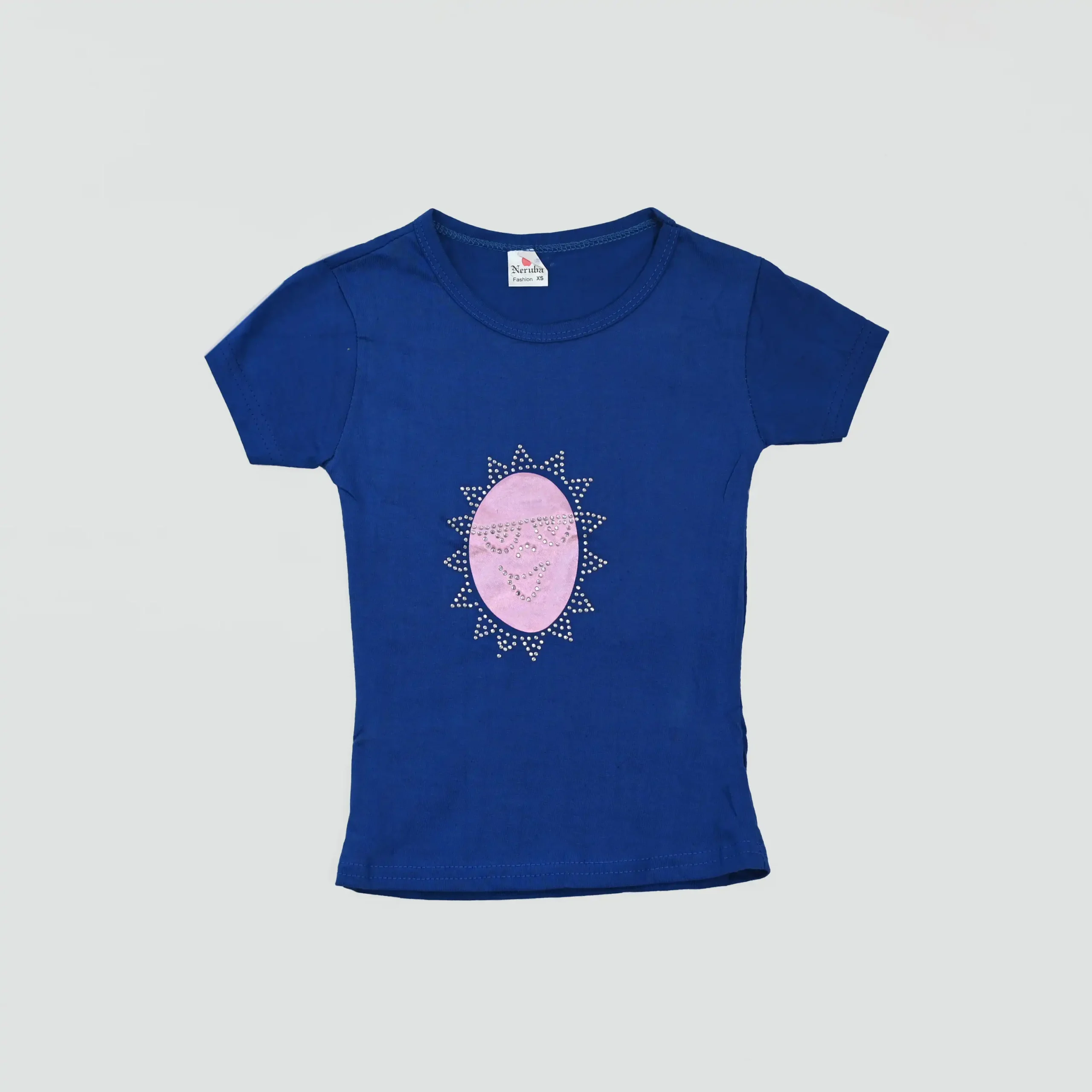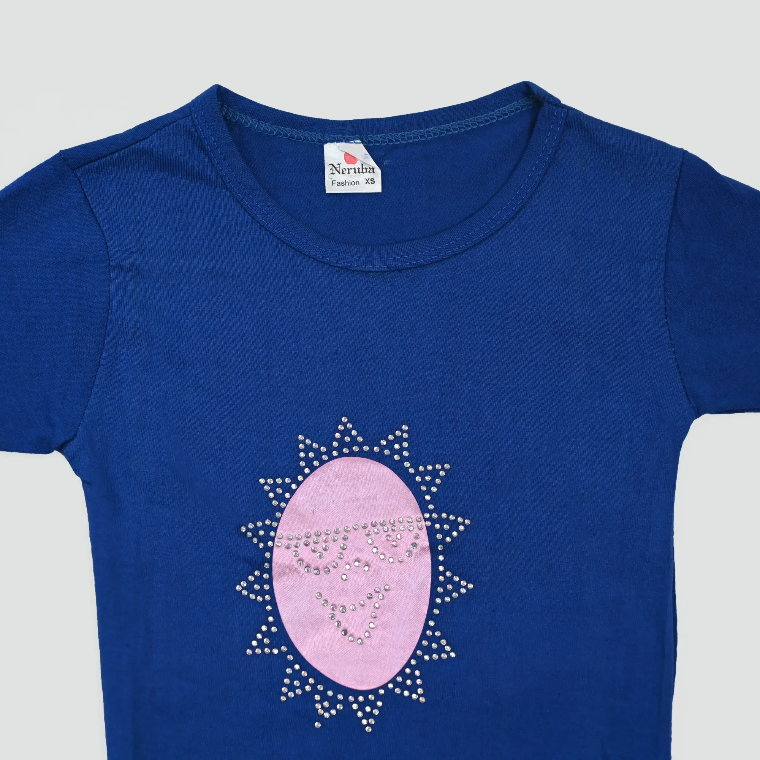 This vibrant blue t-shirt is a burst of sunshine for your little one! It features a captivating sunburst design in the center, adorned with sparkling rhinestone detailing that adds a touch of magic. The design is framed by a delicate pink outline, creating a playful and eye-catching contrast against the blue background. The short sleeves and crew neck make it comfortable and easy to wear, perfect for everyday adventures.
