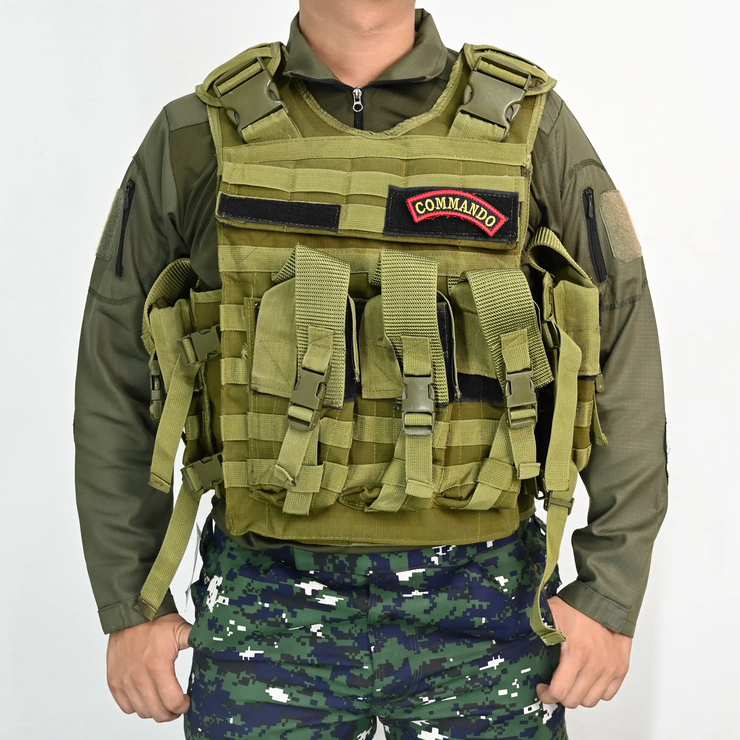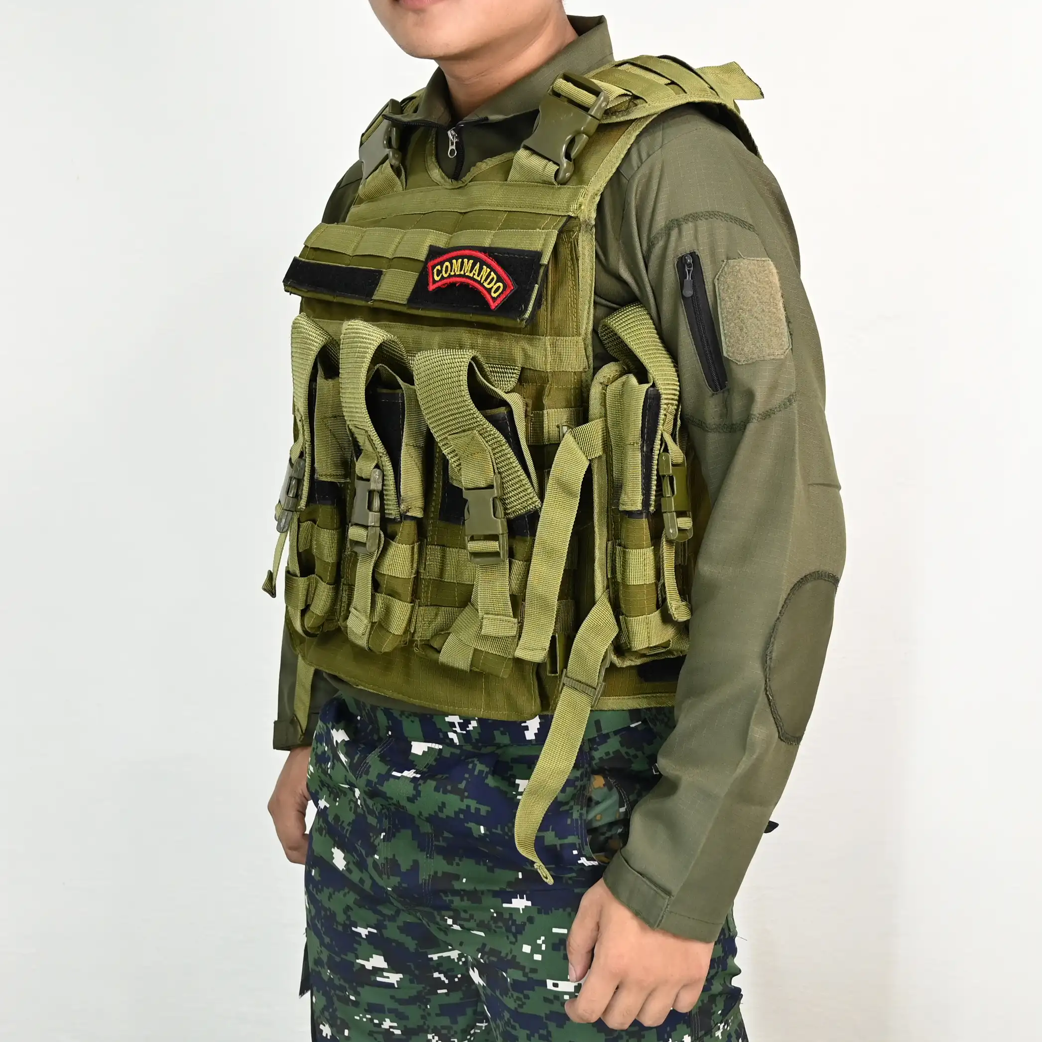 It features multiple front magazine pouches with quick-release buckles for rapid access, MOLLE webbing for modular attachments, and adjustable shoulder and waist straps for a secure, customized fit. The “COMMANDO” patch on the chest adds a bold, military-style identity, ideal for those who take their mission seriously.