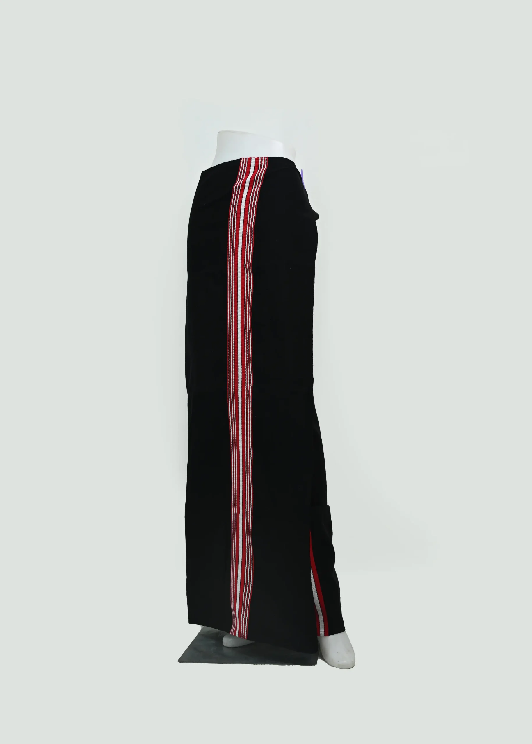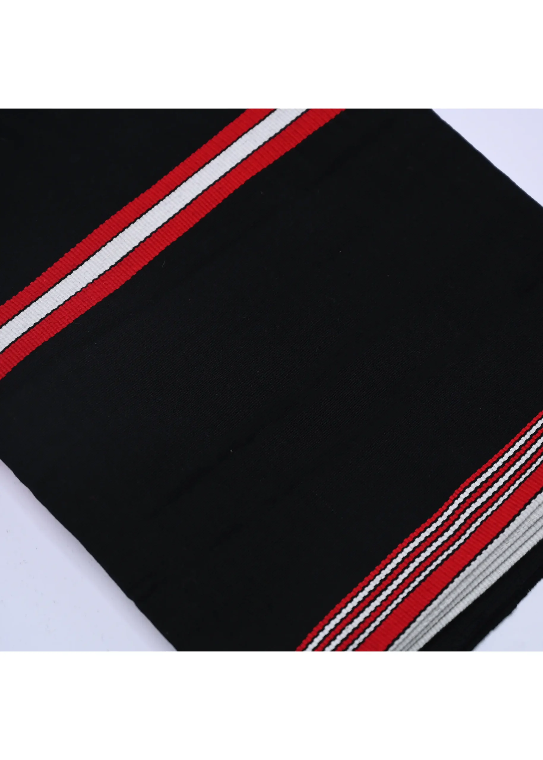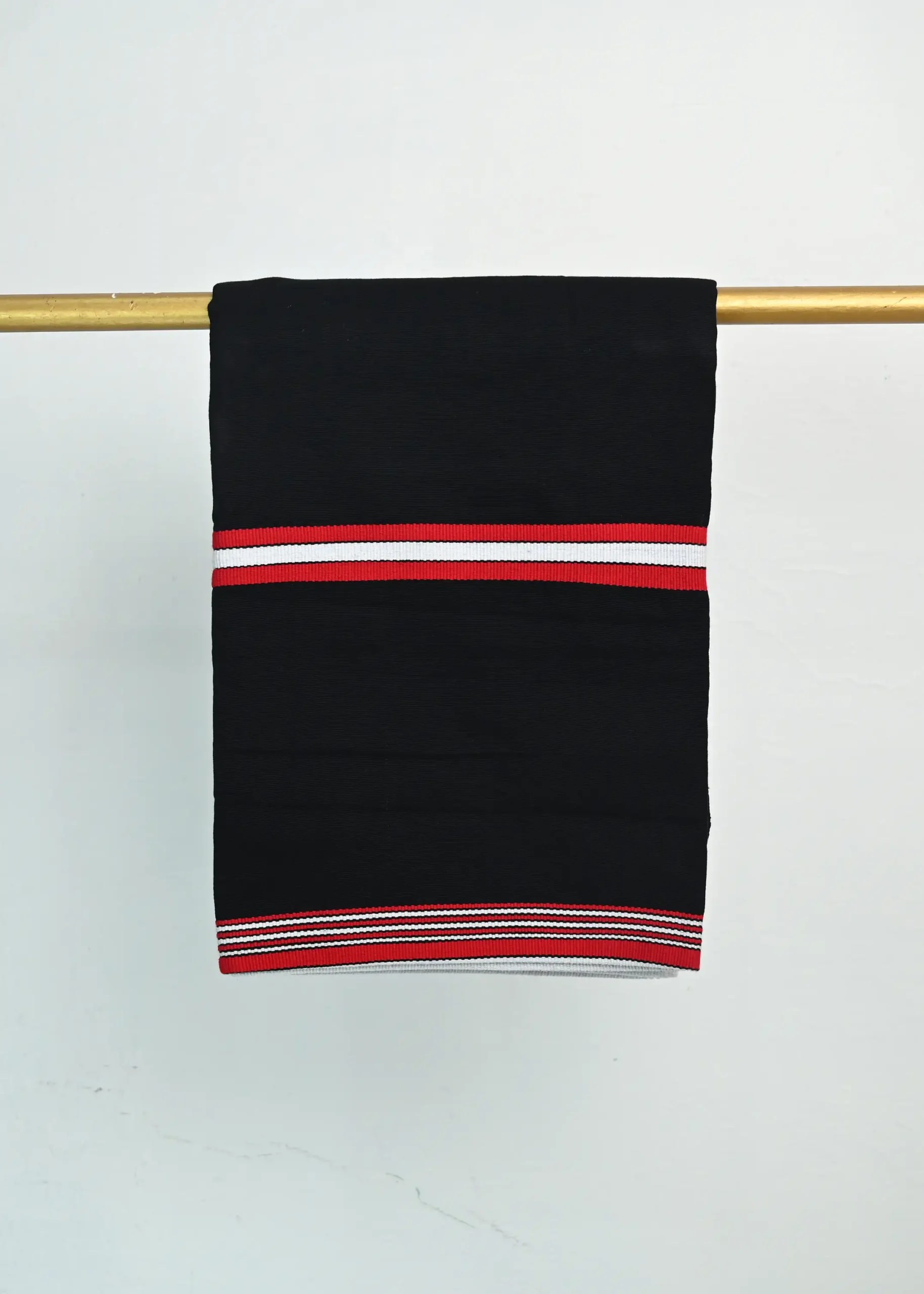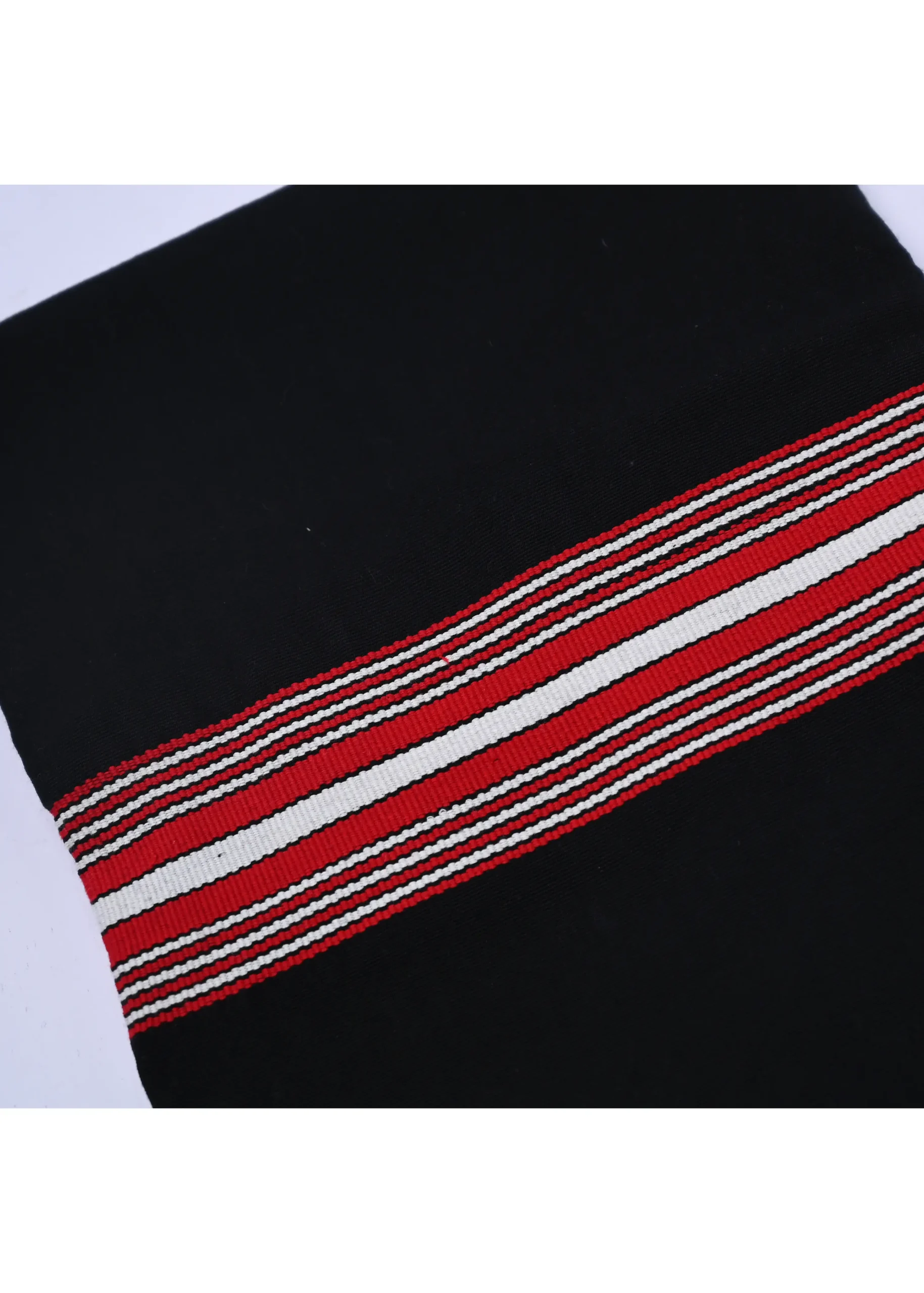Design: This is a minimalist or modern variation of the traditional Puan. It features a solid black base with a striking vertical band (intended to be worn at the side or front) consisting of red and white stripes.