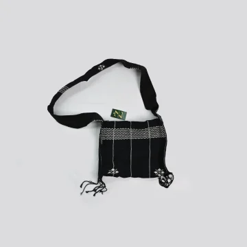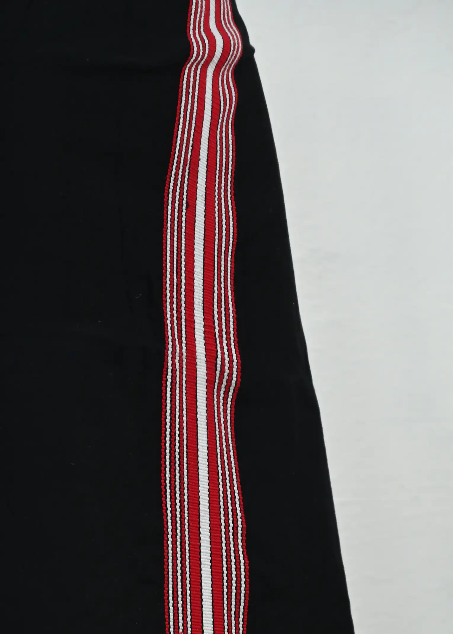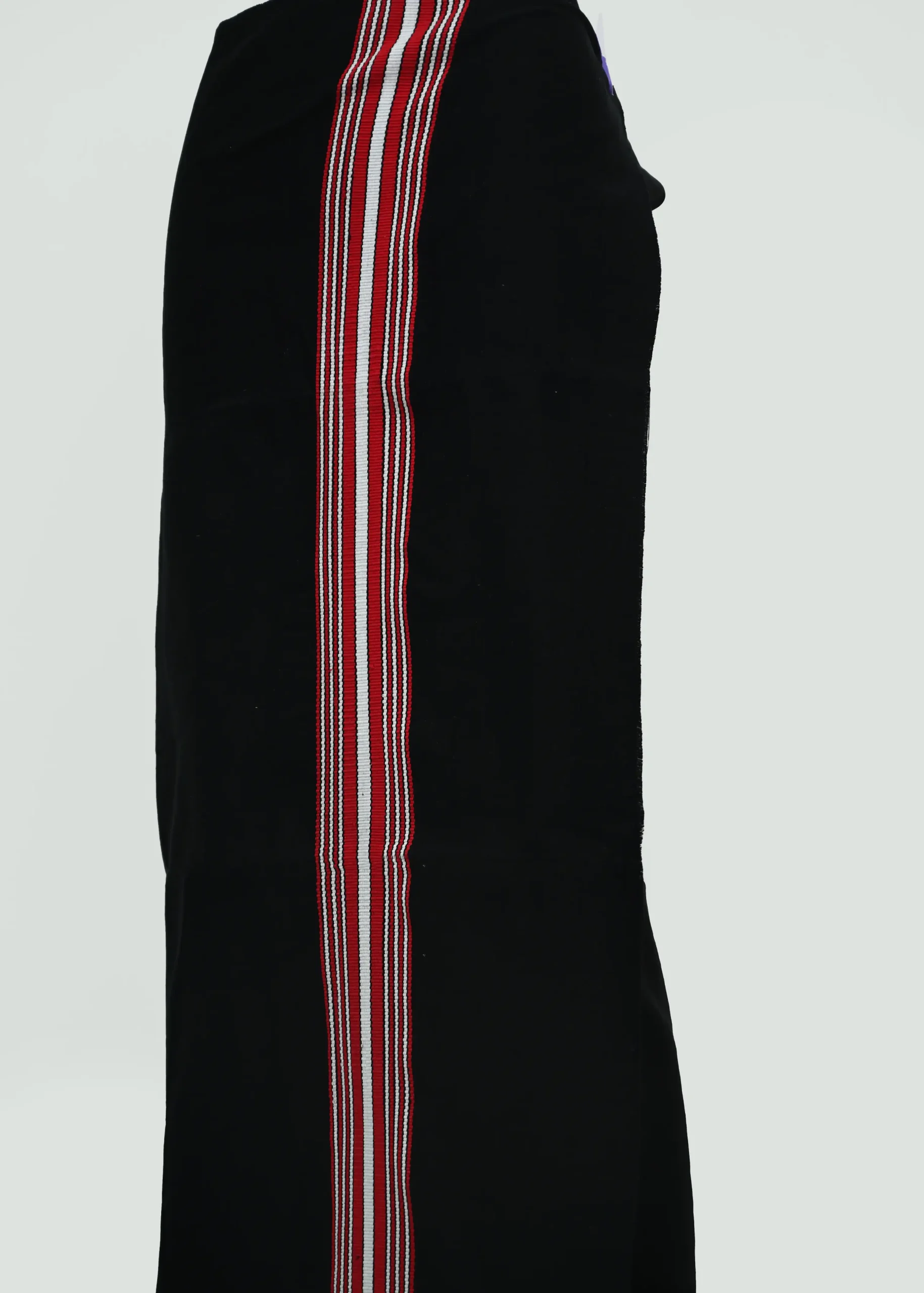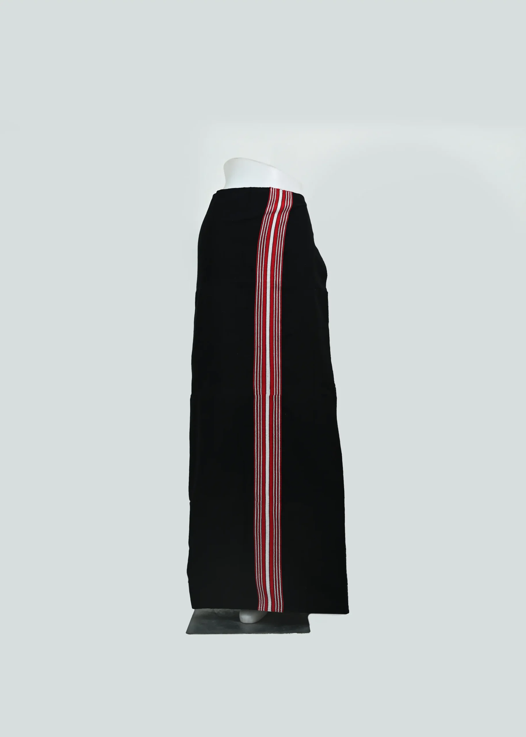 Design: This is a minimalist or modern variation of the traditional Puan. It features a solid black base with a striking vertical band (intended to be worn at the side or front) consisting of red and white stripes.