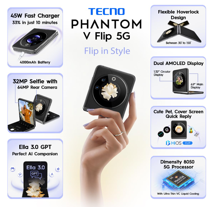 TECNO Phantom V Flip 5G 8GB RAM 256GB Storage (Iconic Black)