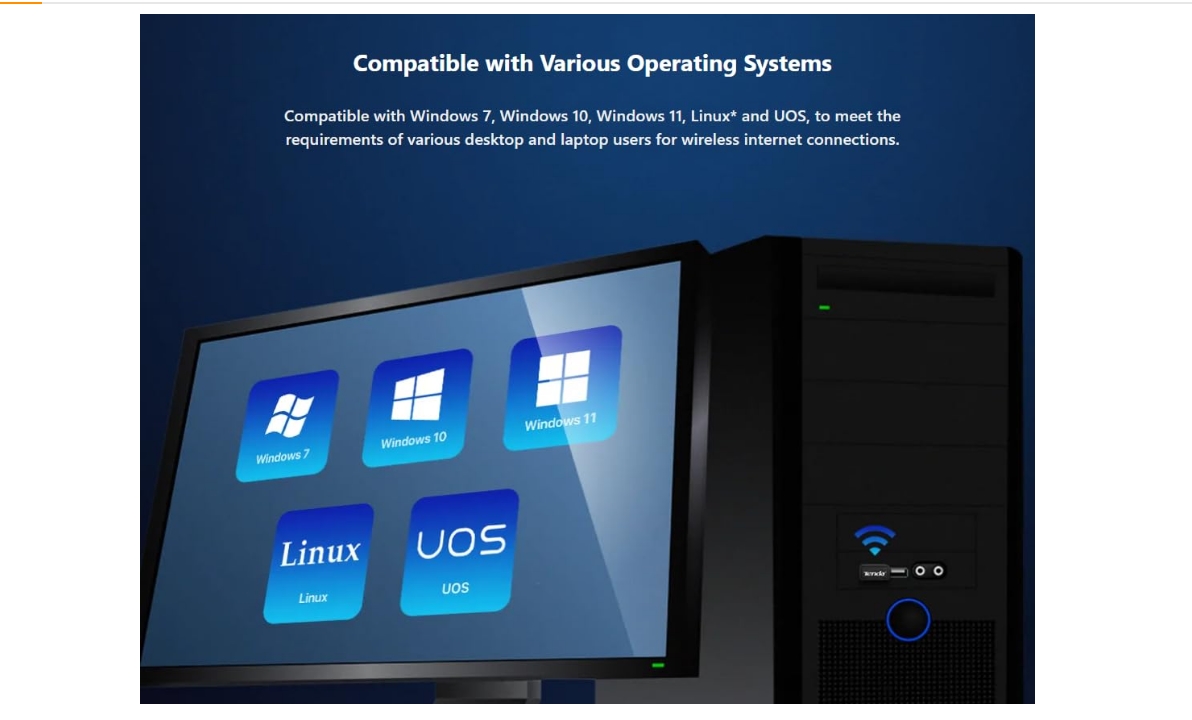- Compatible with Windows 7, Windows 10, Windows 11, Linux* and UOS, to meet the requirements of various desktop and laptop users for wireless internet connections
