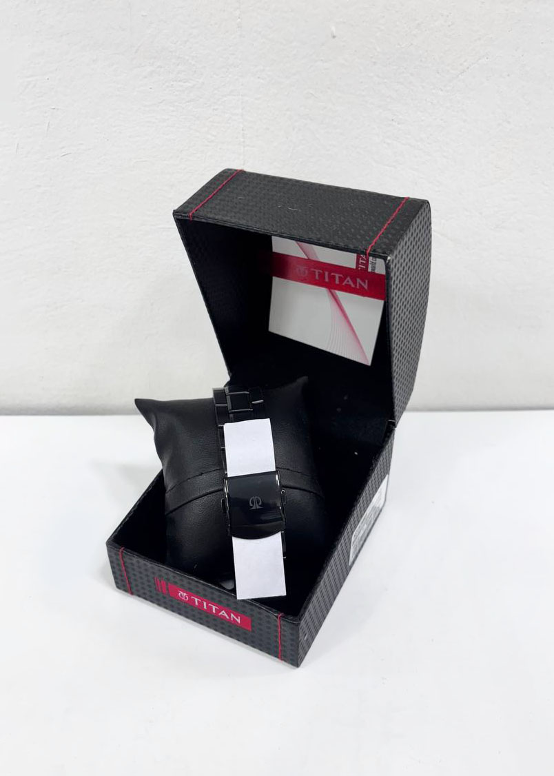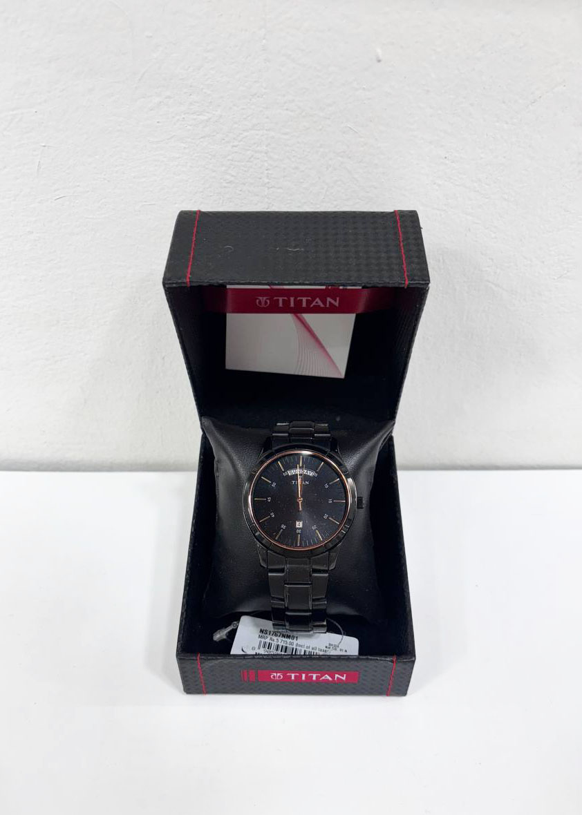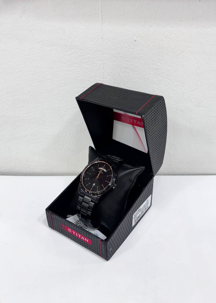 Name: Titan Quartz Analog with Day and Date Black Dial Stainless Steel Strap Watch for Men