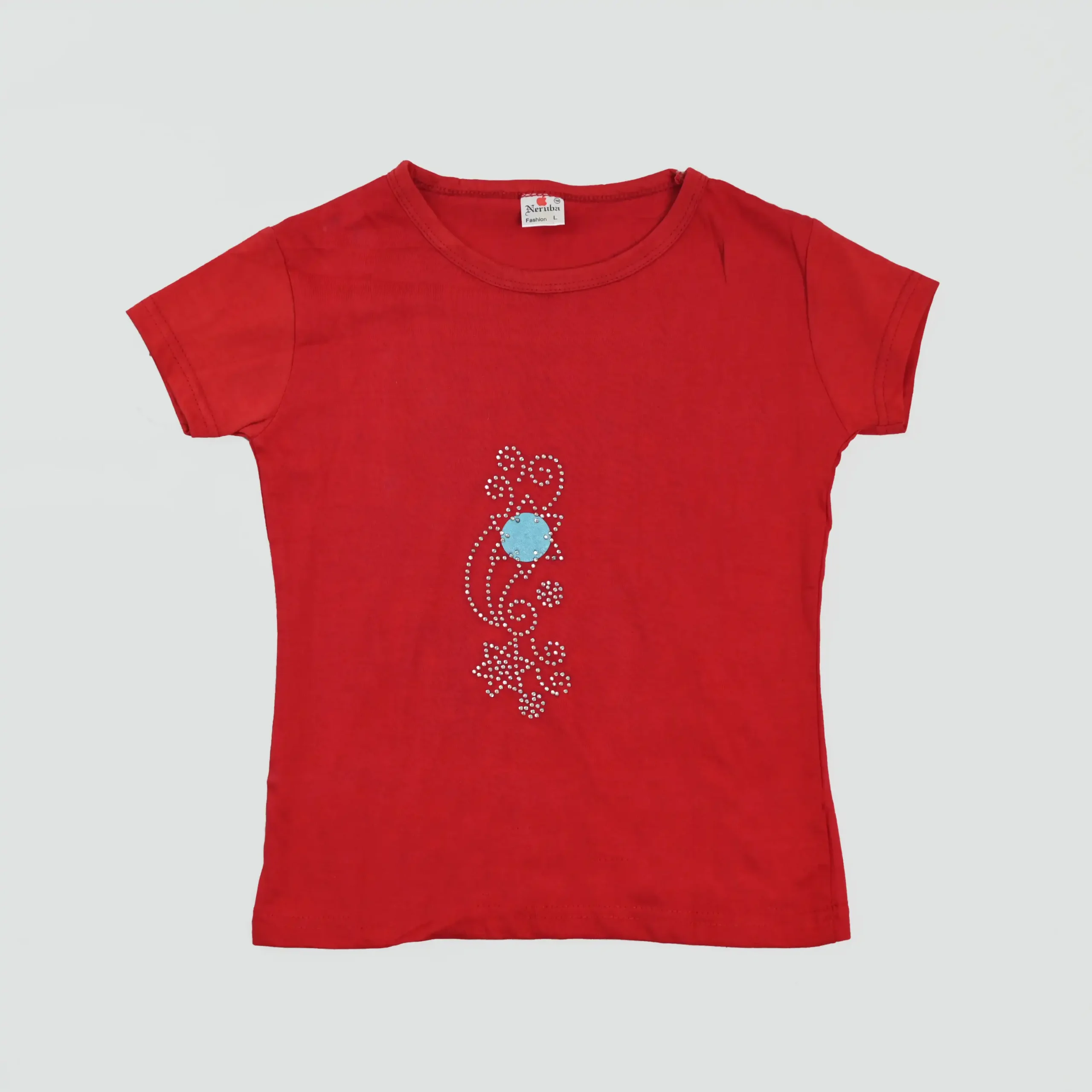 This vibrant red t-shirt is a burst of summery cheer! It features a captivating floral design in the center, adorned with sparkling rhinestone detailing that adds a touch of magic. The design is framed by delicate swirls and vines, creating a playful and eye-catching look. The short sleeves and crew neck make it comfortable and easy to wear, perfect for everyday adventures.