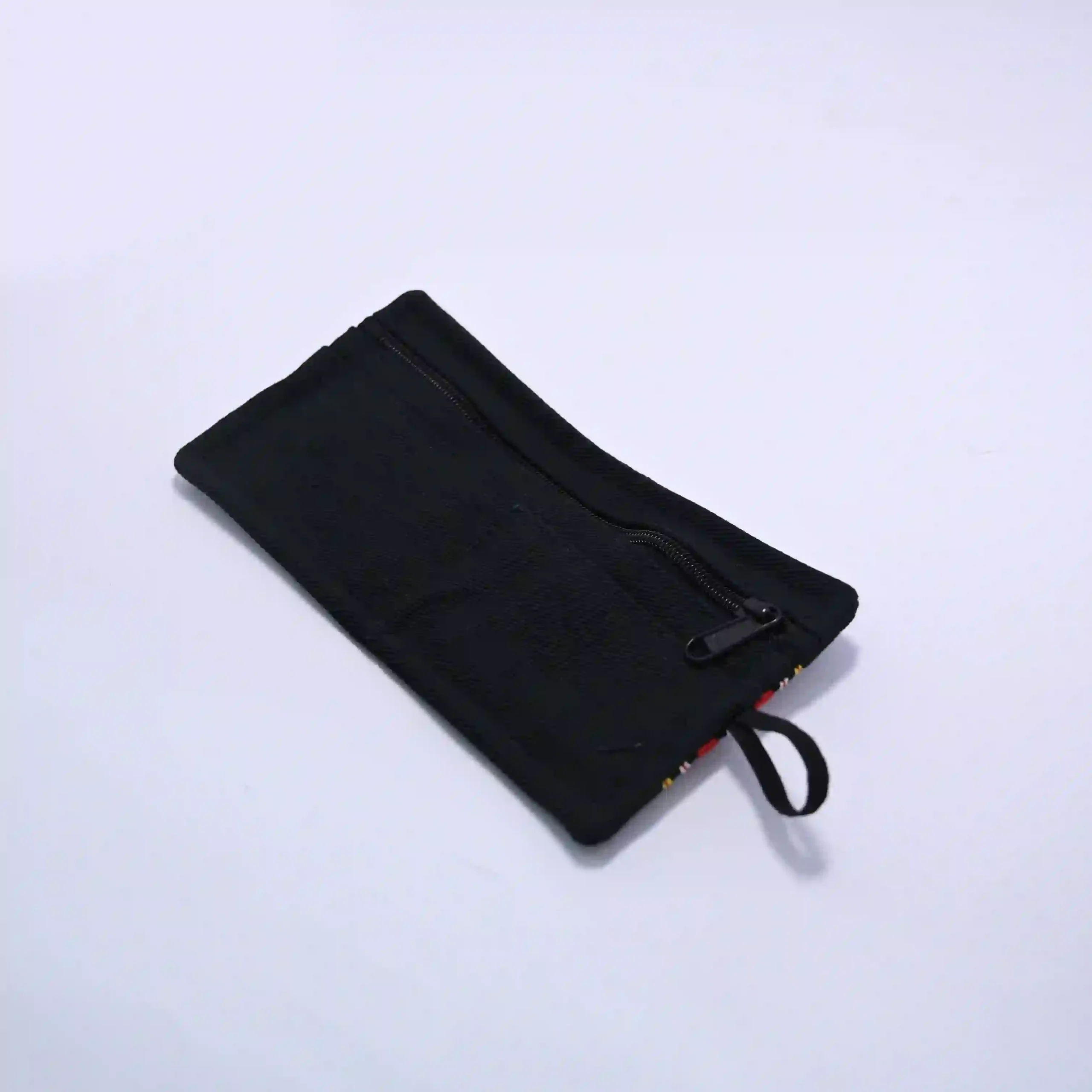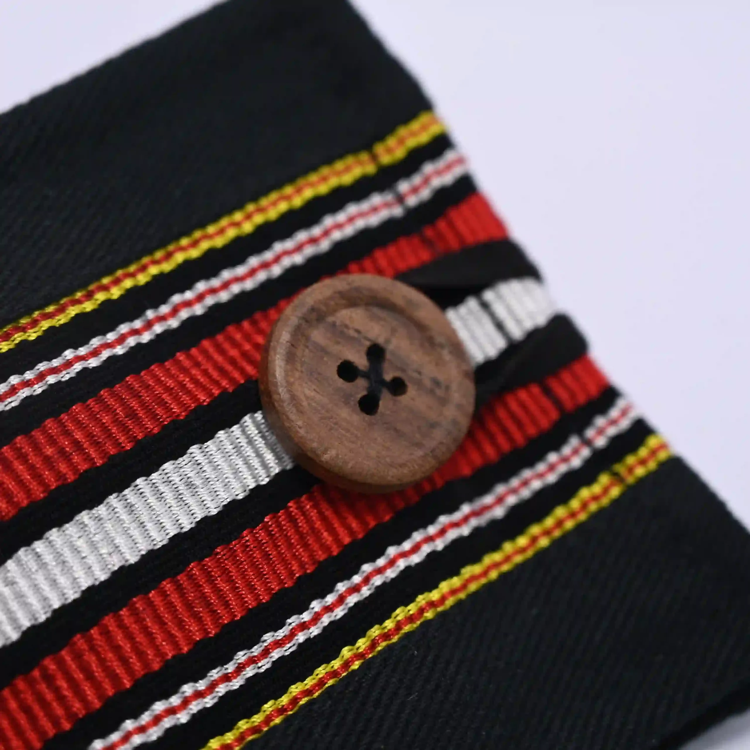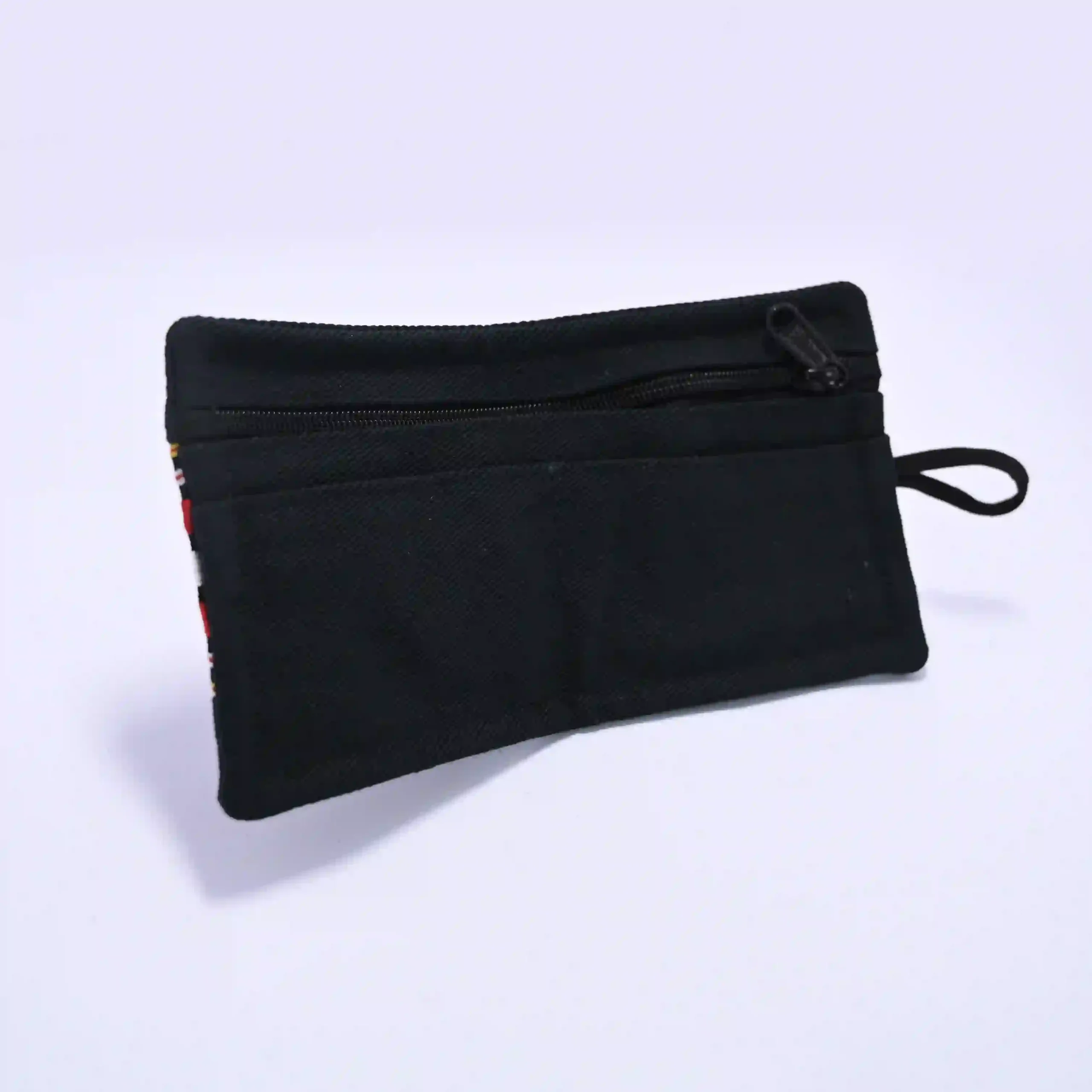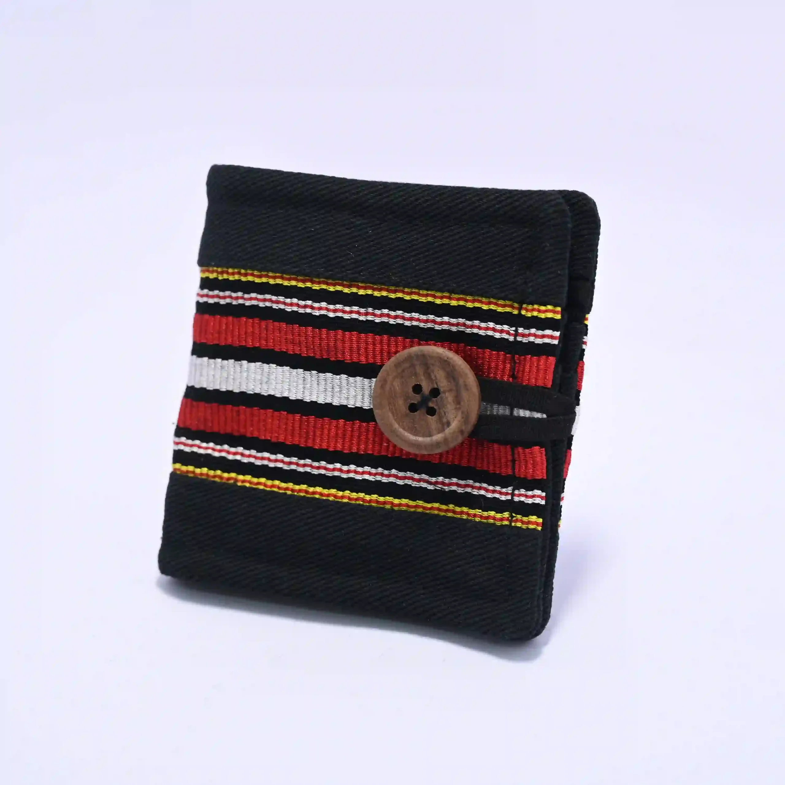 Add a touch of tradition to your everyday essentials with this handmade Zopar exclusive pouch wallet, beautifully crafted using premium black fabric and highlighted with a bold traditional woven stripe design in red, white, and yellow tones. This unique accessory reflects cultural elegance while maintaining a modern minimalist look.