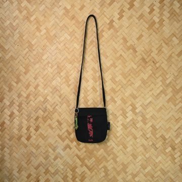 The bag features a premium black body with a striking vertical floral strip in rich pink tones, giving it a graceful and modern ethnic look. The highlight of this design is the charming handcrafted side accessory with a wooden ring and green thread tassel, adding a natural, artistic touch that makes this sling bag stand out.