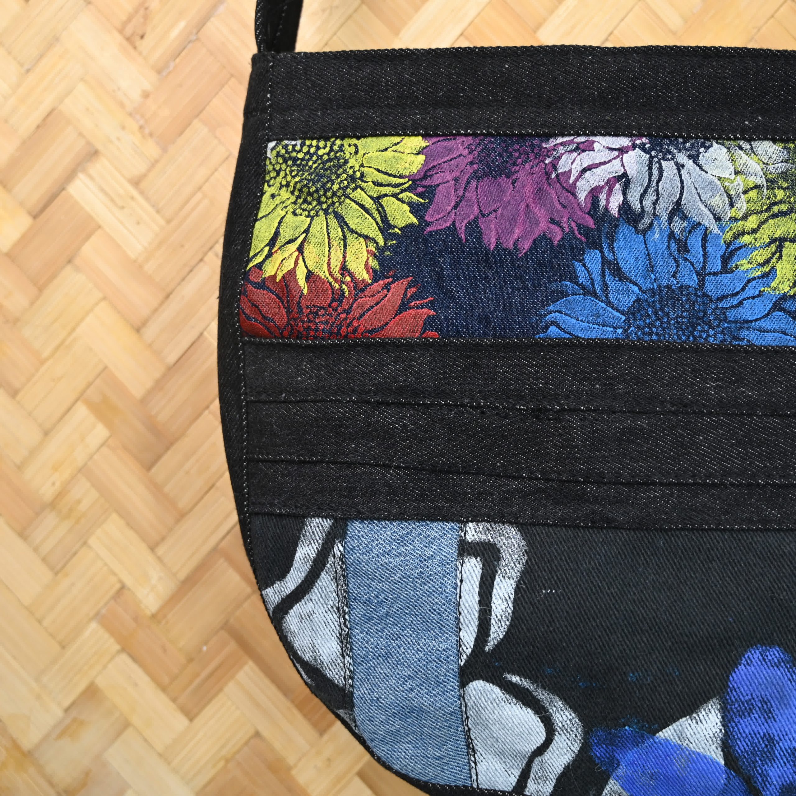 The floral design strip is made using a printed cotton fabric panel, neatly stitched onto the front to create an elegant contrast. The combination of sturdy canvas and soft cotton gives the bag a perfect blend of toughness and beauty.